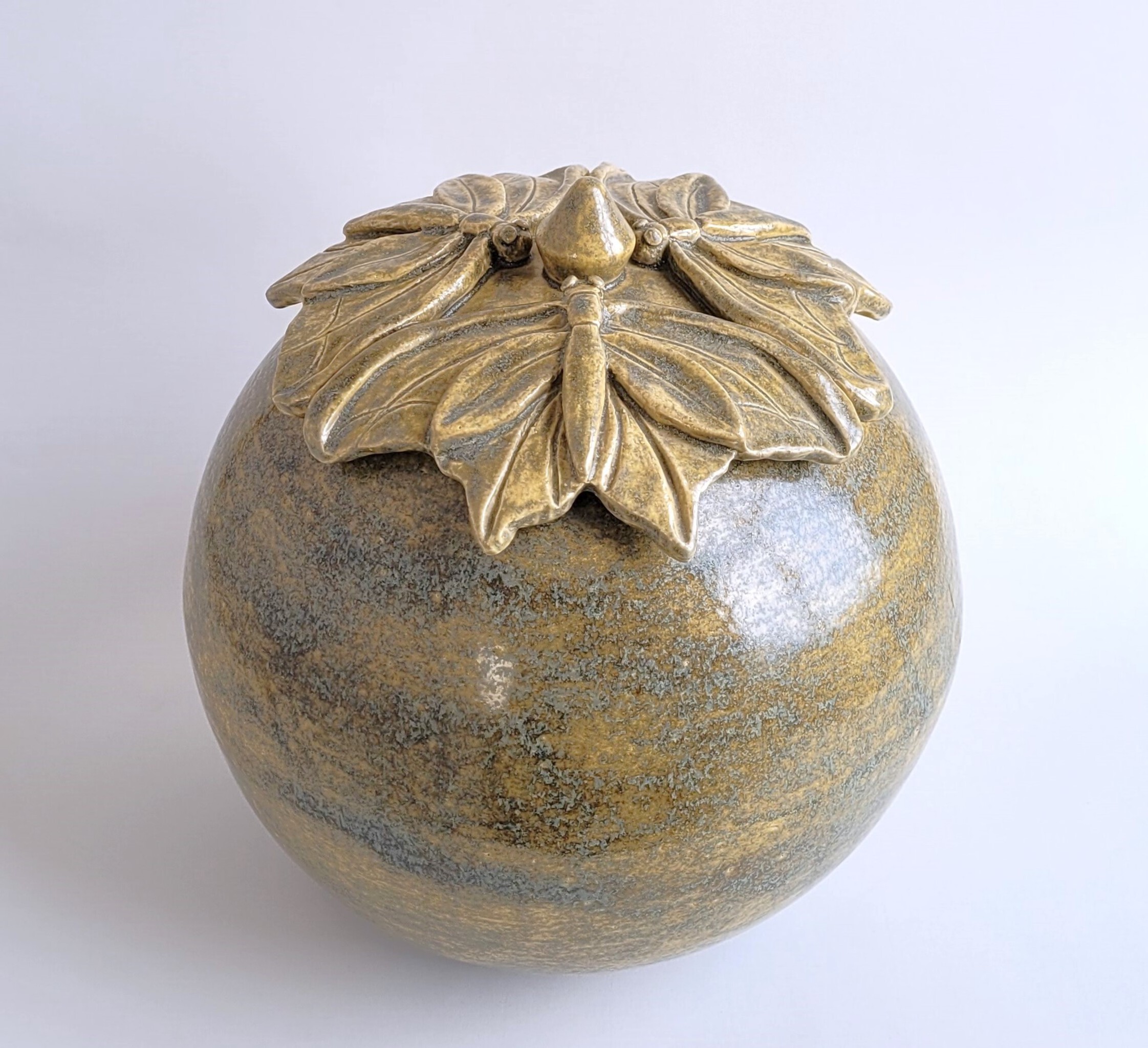 Bol, met de hand opgebouwd, biscuit gestookt en vervolgens geglazuurd in een zandkleurig, iriserend glazuur. Op het deksel zijn drie identieke vlinders geplaatst.