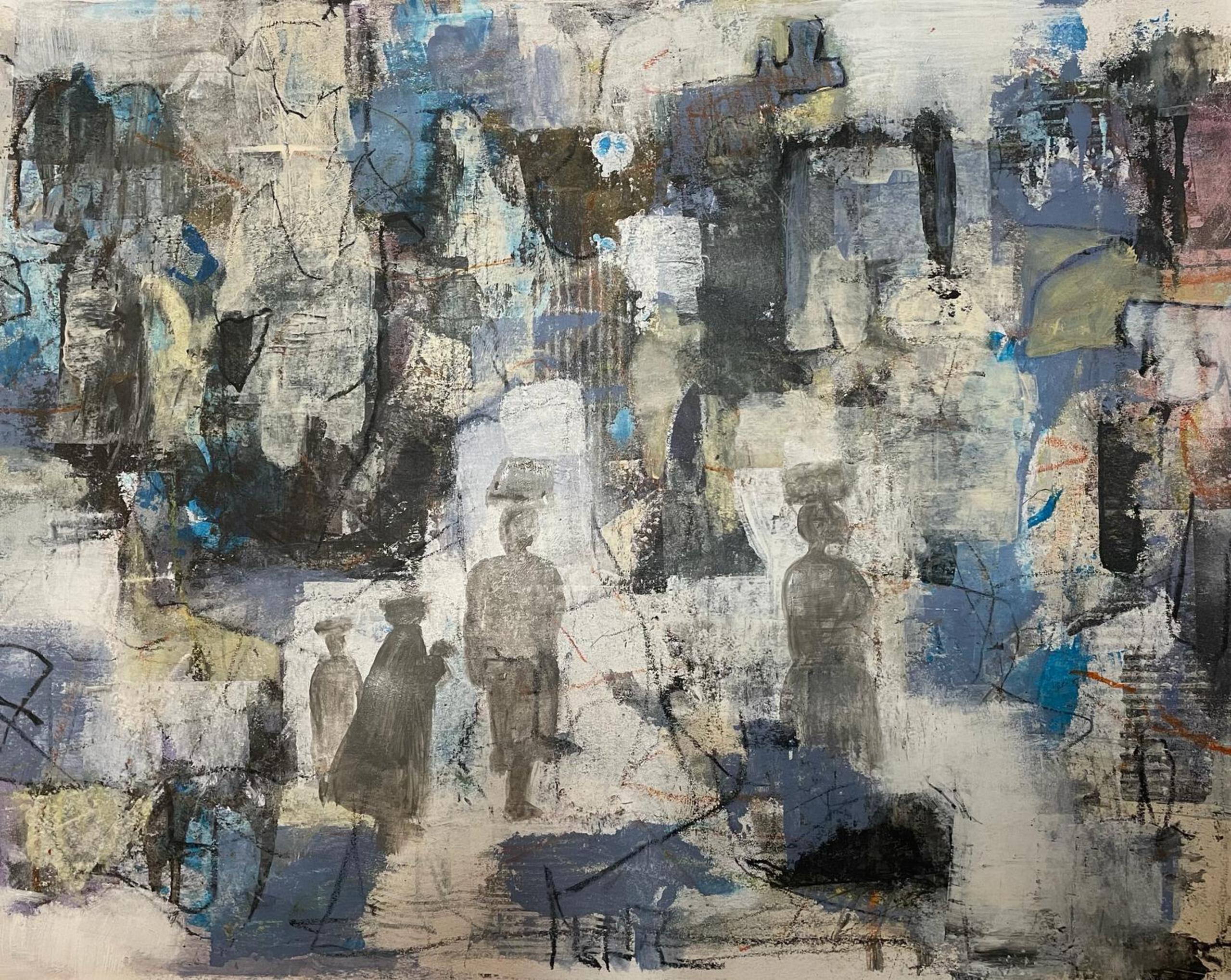 Gemengde techniek: transfer (gelliplate), acryl, houtskool 40 x 60 cm