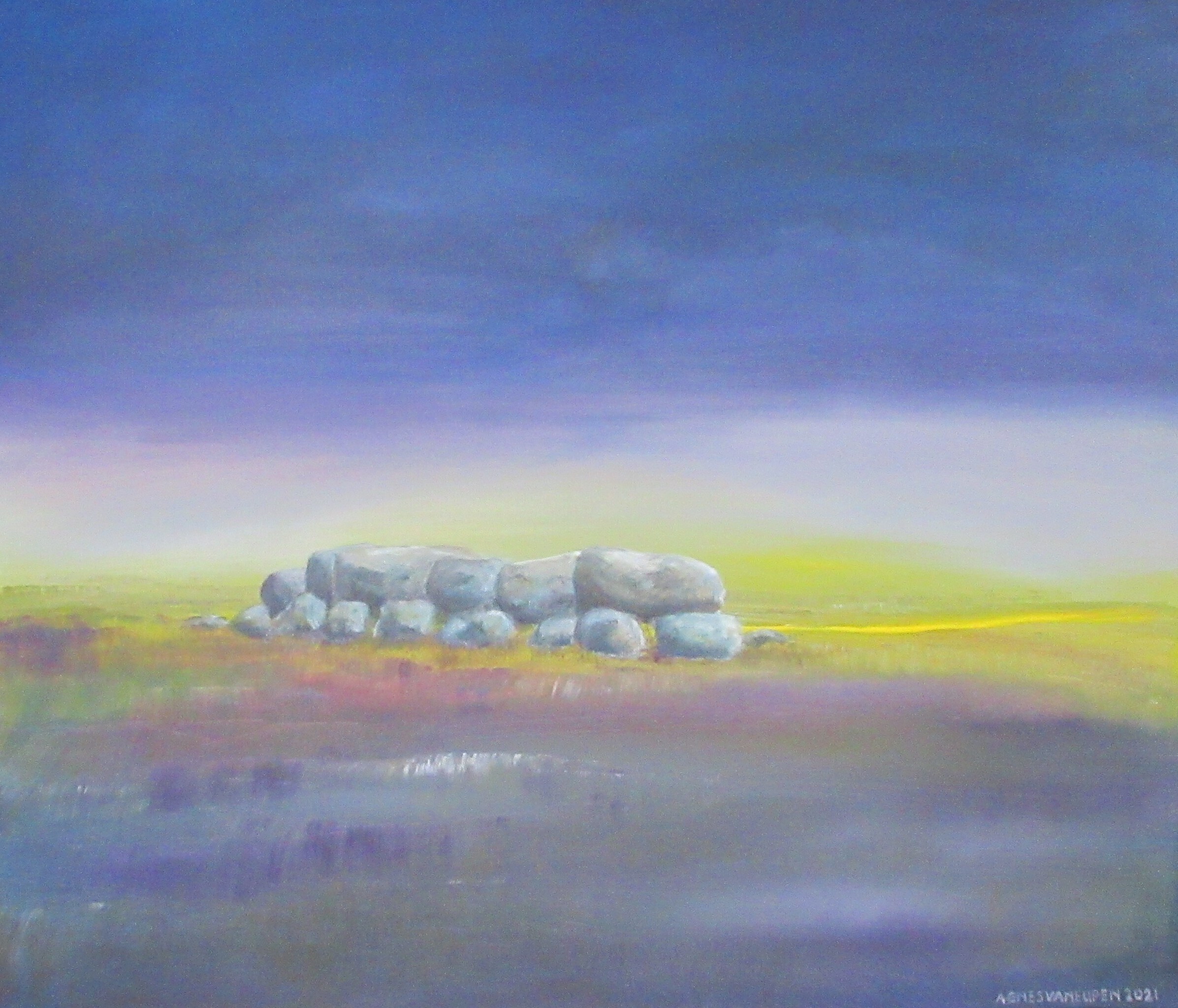Landschappen zijn mijn onuitputtelijke inspiratiebronnen. Kleuren, lijnen en verbeelding voegen zich tot impressies waarin het spanningsveld tussen licht en donker een verstilde dynamiek oplevert.
