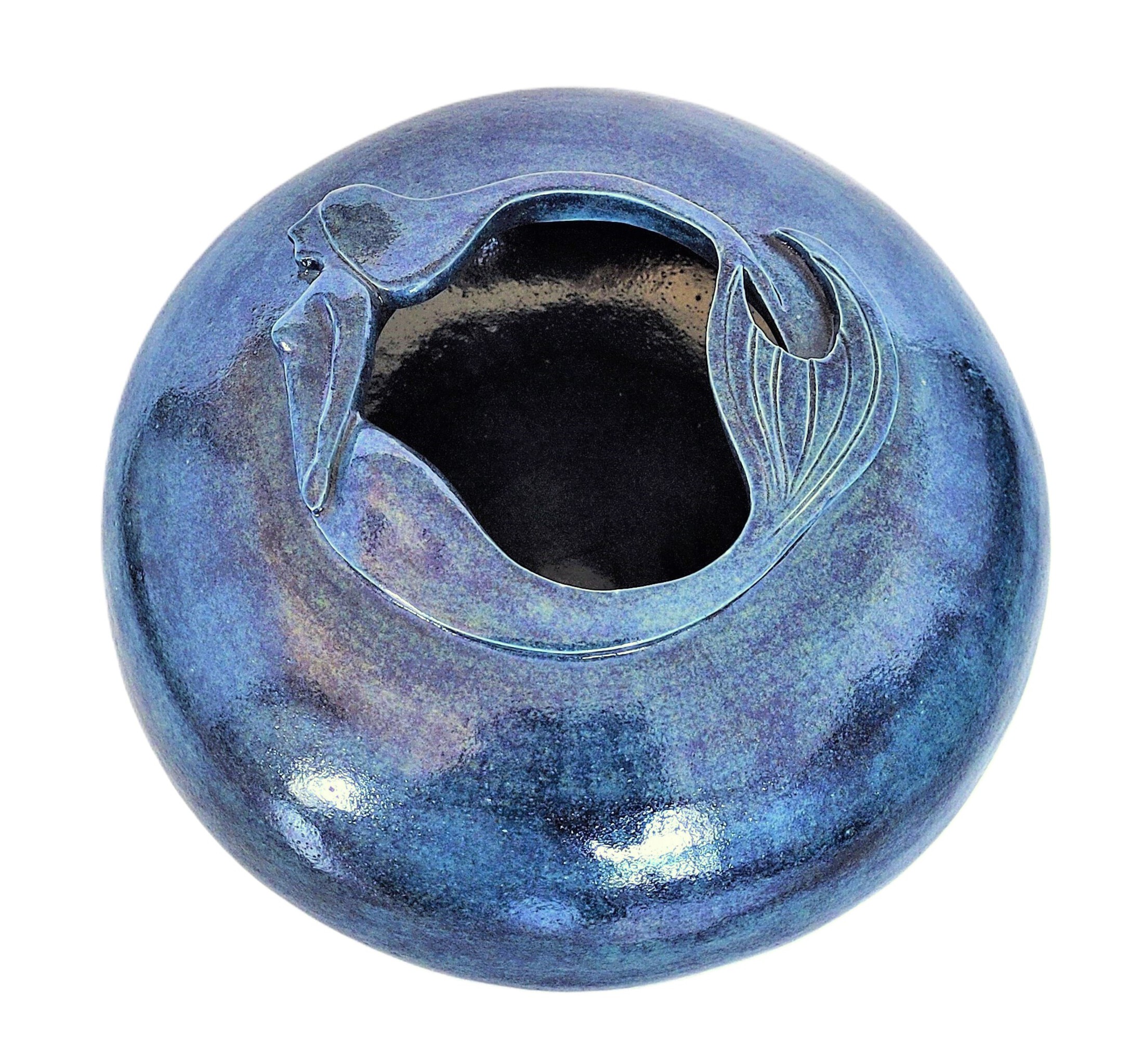 Object, met de hand opgebouwd, biscuit gestookt en vervolgens geglazuurd in een blauw, iriserend glazuur. Rond de opening aan de bovenzijde is een gestileerde zeermeermin weergegeven..