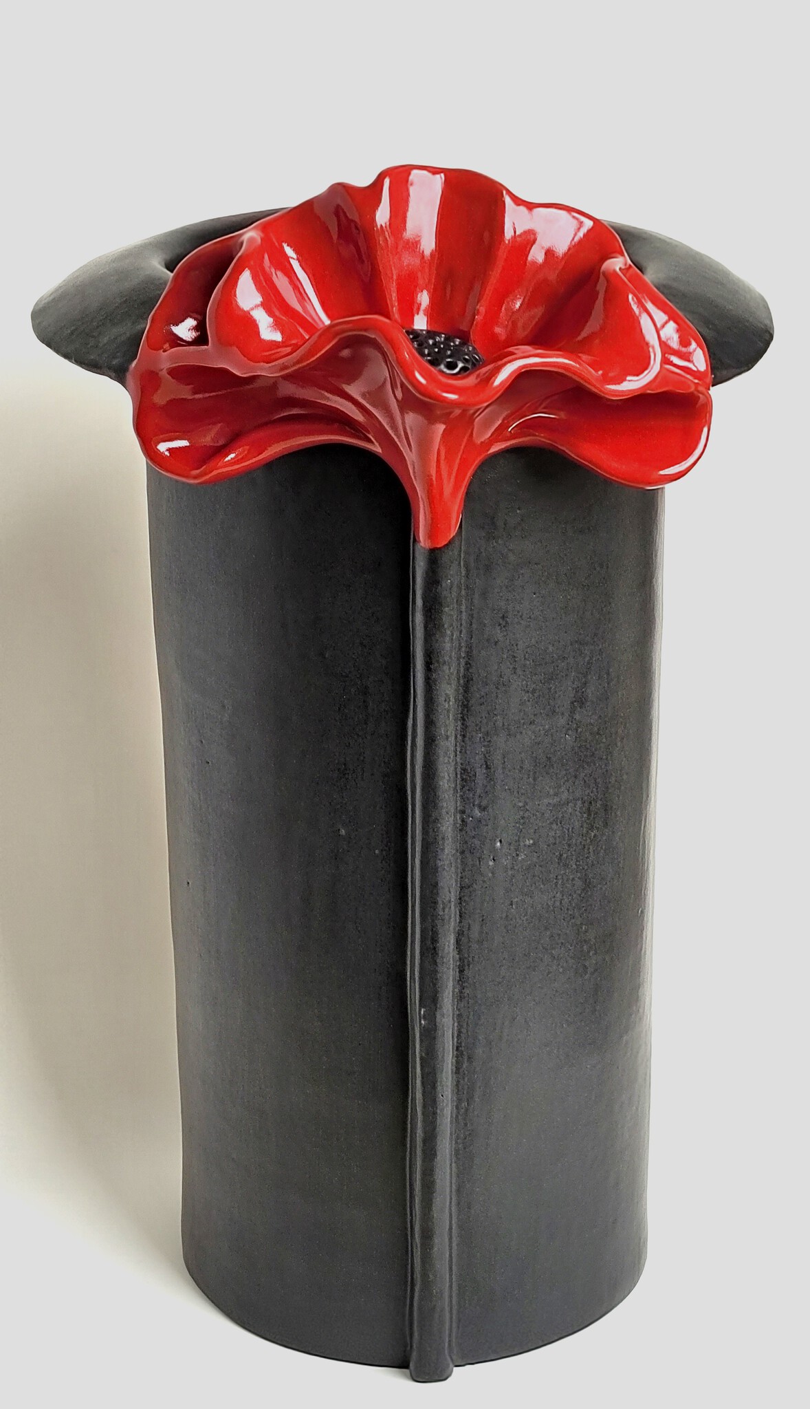 Vaas, met de hand opgebouwd, biscuit gestookt en vervolgens zwart en rood geglazuurd.