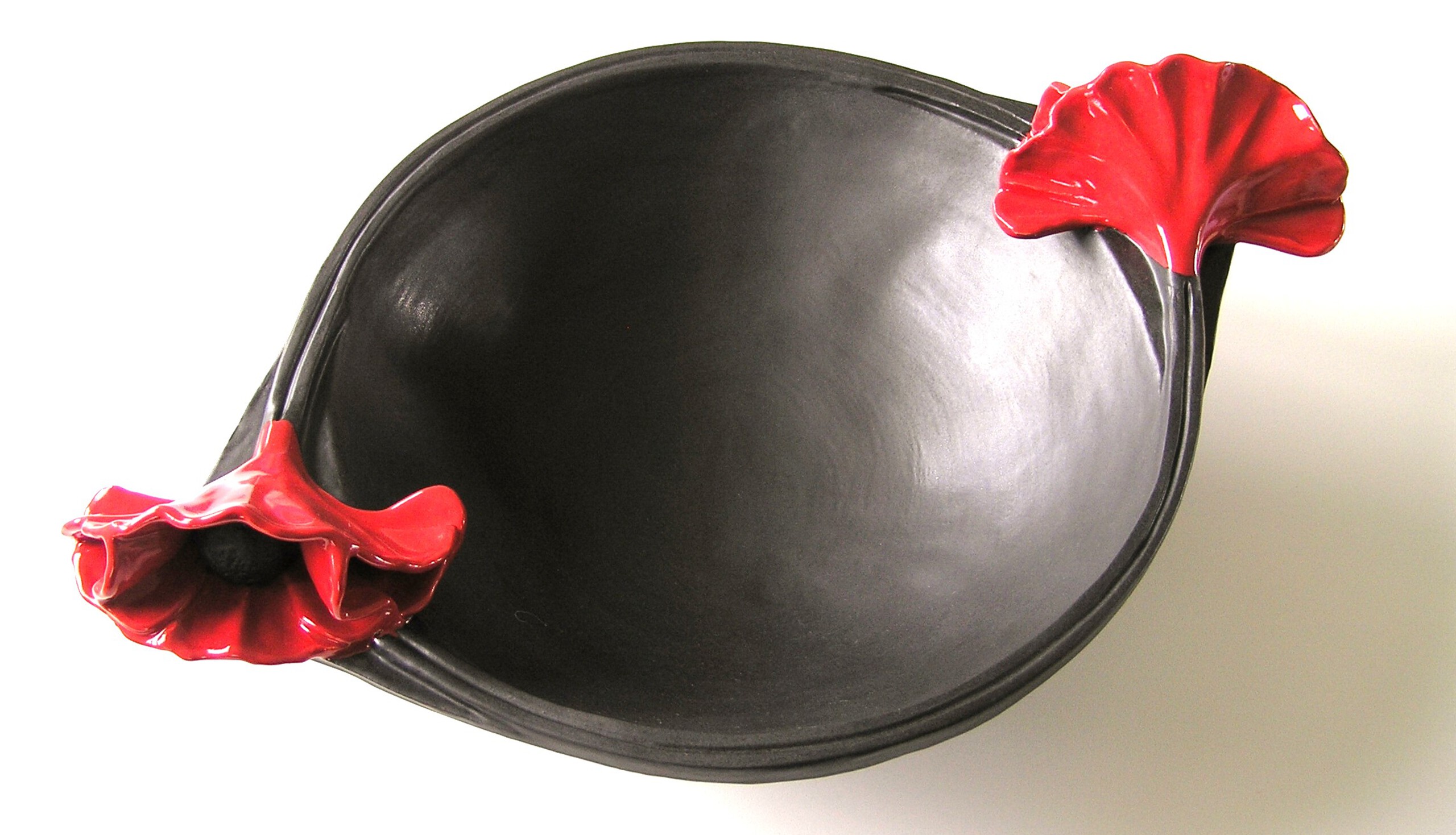 Schaal, met de hand opgebouwd, biscuit gestookt en vervolgens voorzien van een zwart en rood glazuur.