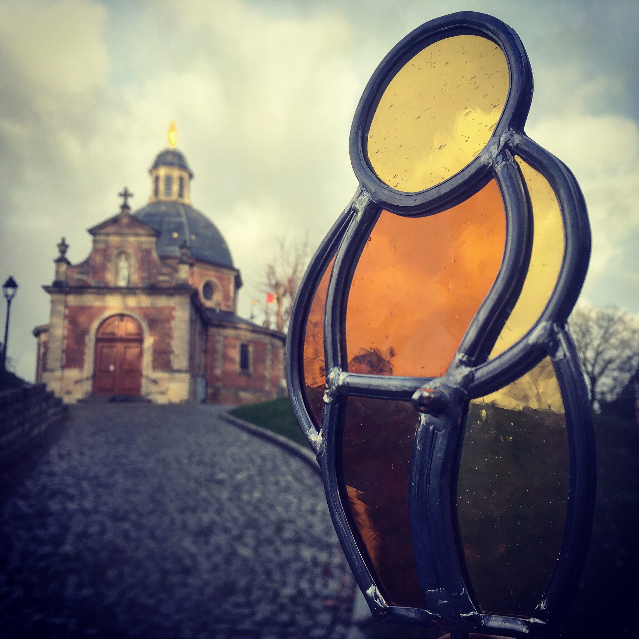 Het Geraardsbergse Manneke Pis in glas-in-lood . Geplaatst op een kasseisteen als sokkeltje .
