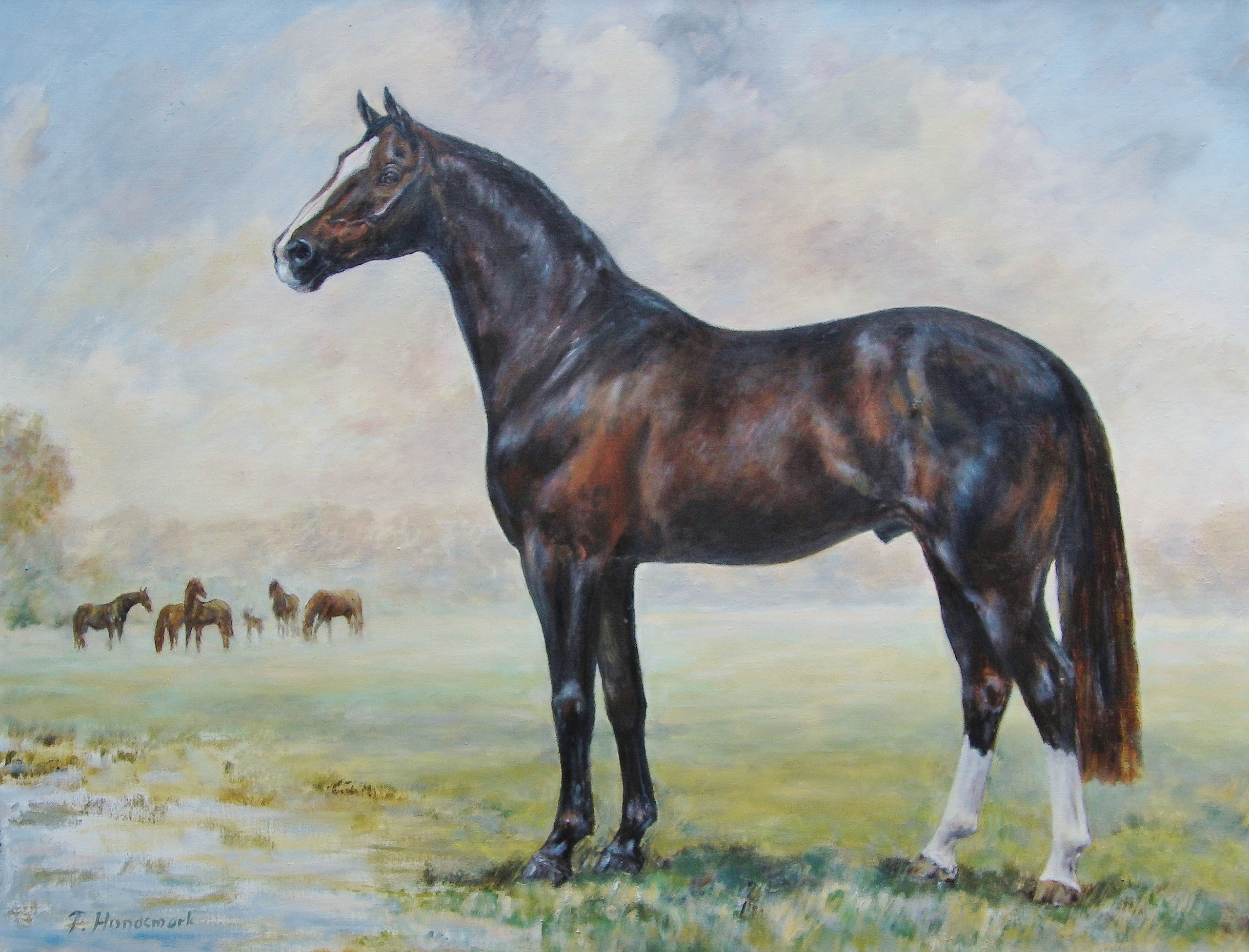 De stamvader van vele top springpaarden, VOLTAIRE, naar een foto uit zijn jonge jaren, geschilderd in olieverf op linnen.