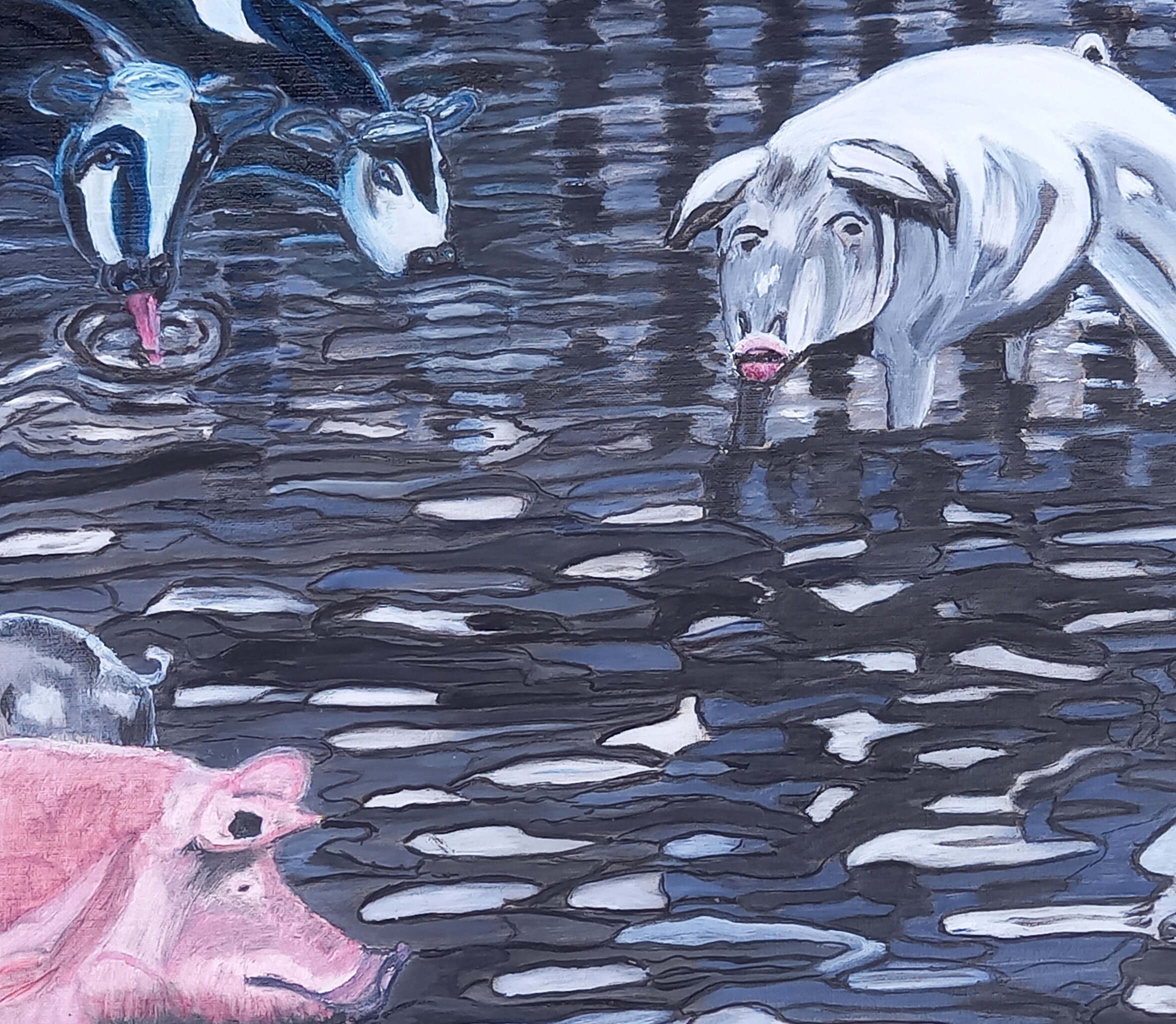 Er is veel te doen over boeren in de afgelopen jaren; alles teveel, te groot. Hier zijn dieren te zien in het nat. Want ook kan het héél nat zijn. Ook téveel regen op dit moment.
