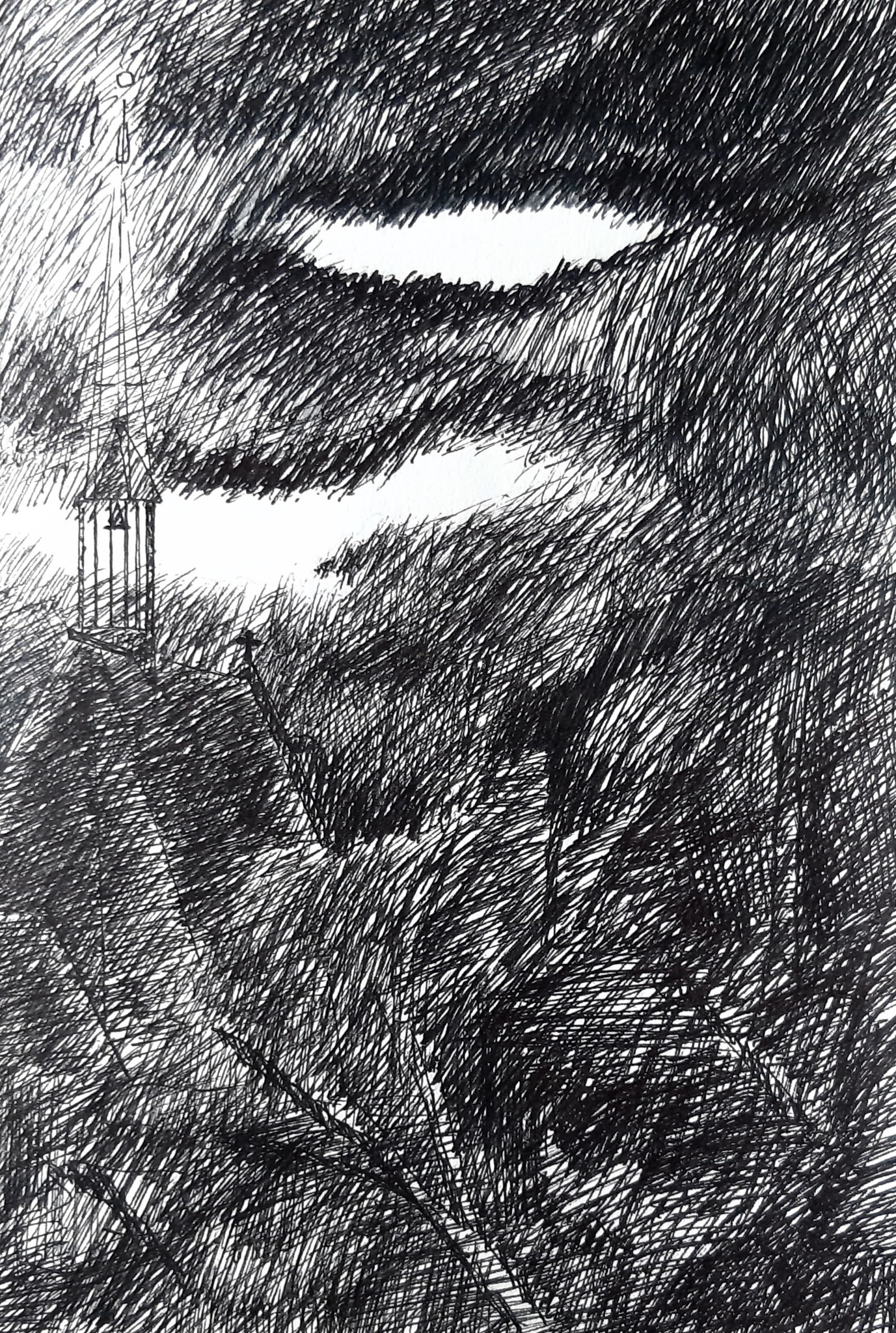 Wolken Licht Papier Bomen Donker Inkt Gebouw Dreigend