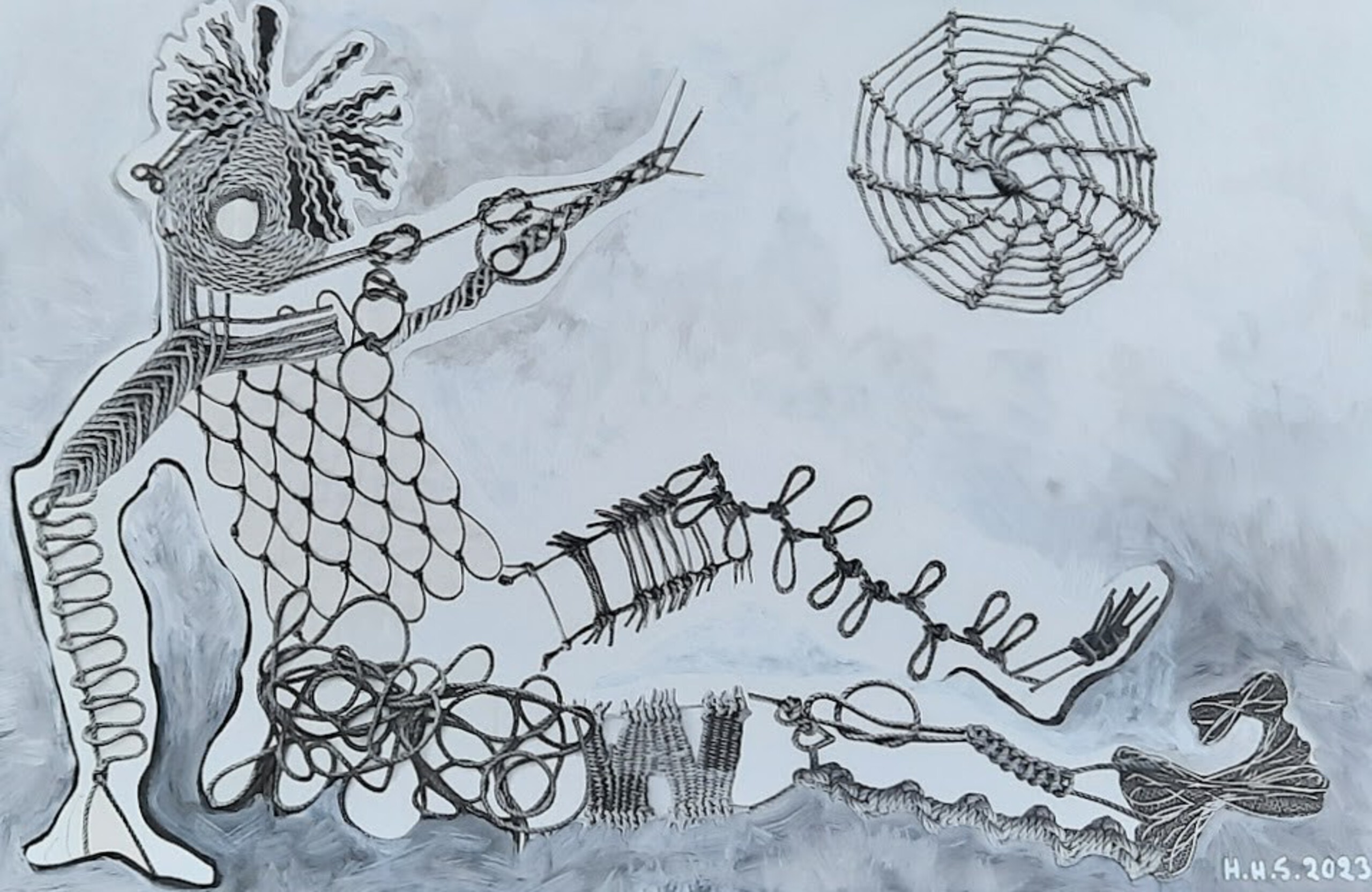 "Waterig zonnetje" collage op board h77xb47cm. 2023