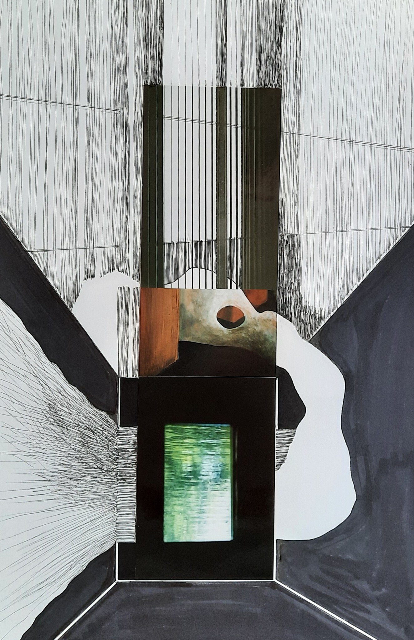 Fotocollage met schildering en lijntekening op papier.