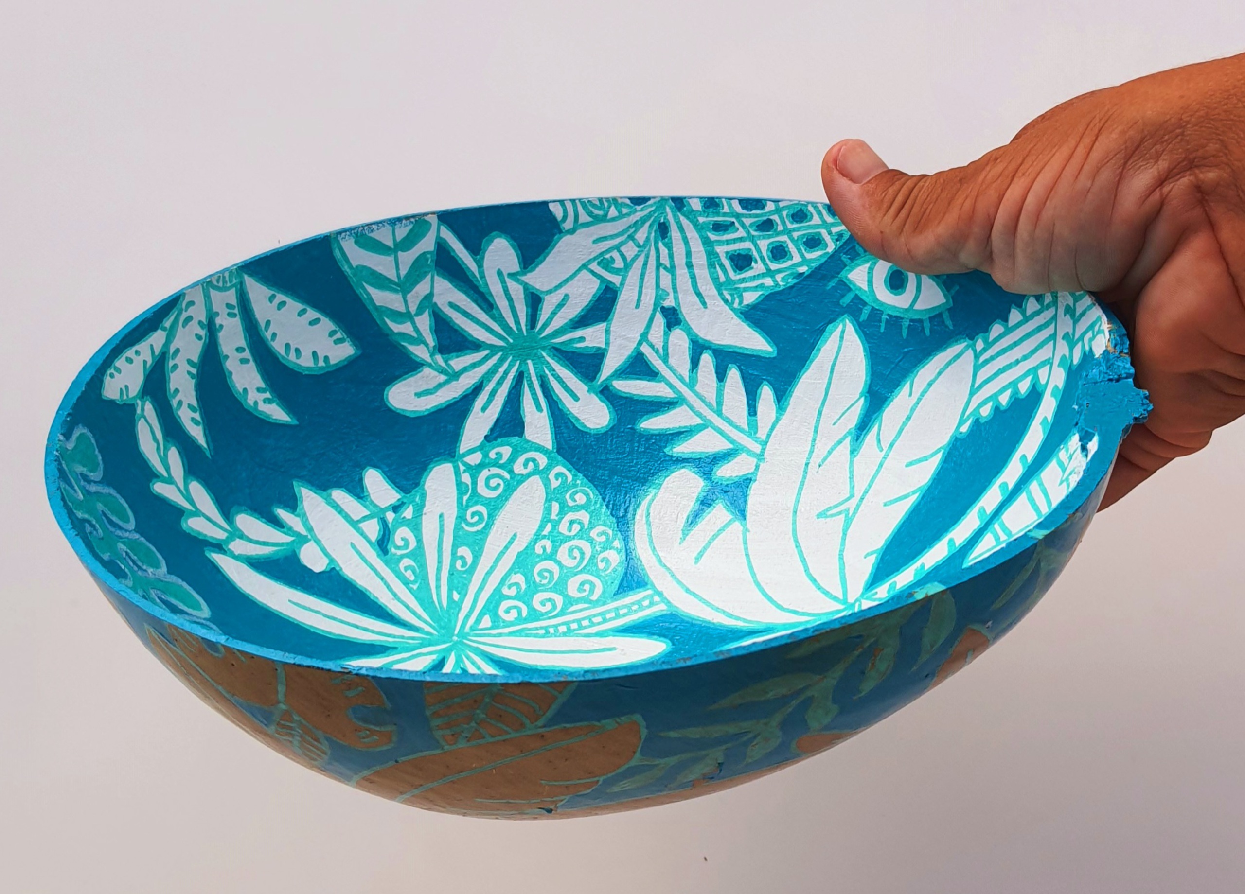 Het zagen en schoonmaken is een heel proces maar de kalebas is het waard! Geen enkele schaal is hetzelfde, dat maakt ze dan ook zo leuk om te beschilderen tot een uniek gebruiksvoorwerp. De kalebas groeit in het Caribisch gebied en al duizenden jaren voor Chr. maakten mensen al gebruiksvoorwerpen van deze vrucht.