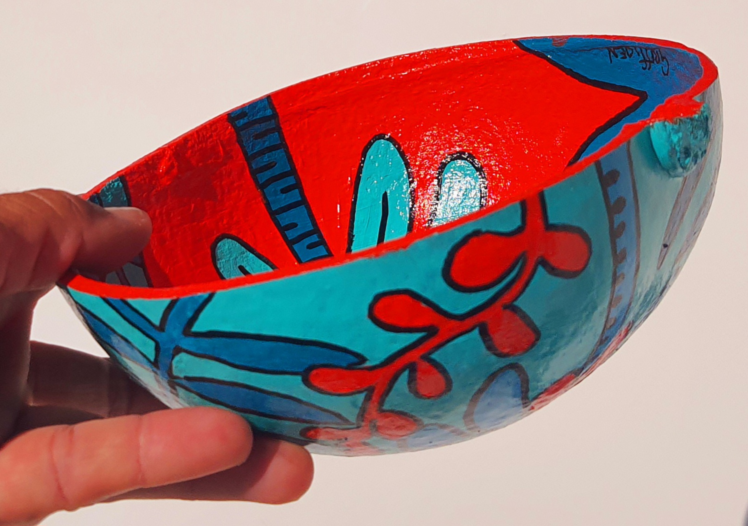 Voor deze kalebas heb ik rood en turquoise gekozen, deze kleuren horen bij deze vrucht die ik in het Caribisch gebied heb omgetoverd tot een prachtige schaal. De kalebas is uniek er is er maar een van.