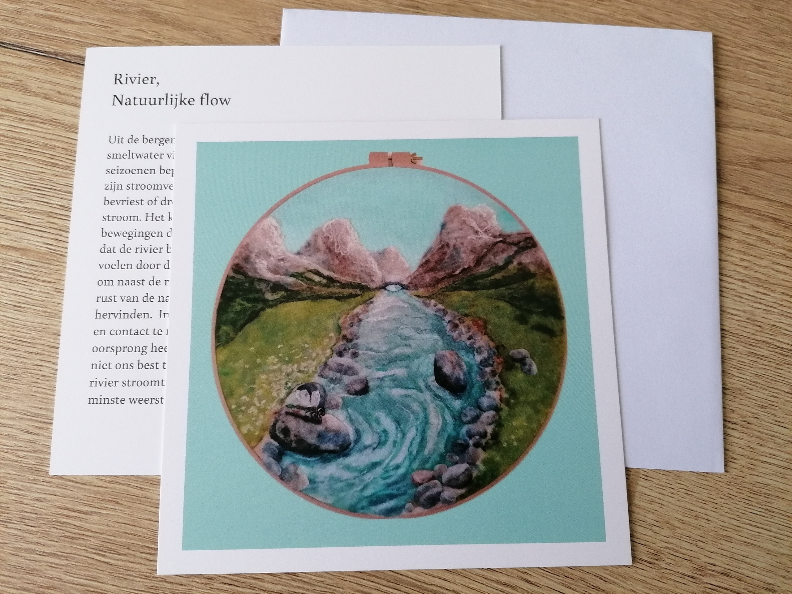 Kunstkaart van vilt kunstwerk Rivier "Natuurlijke flow" 14x14cm. Incl. envelop Ik wil een kunstkaart bestellen Vermeld bij bestellen om welke kunstkaart het gaat, aantal en het adres waar het naar toe gestuurd mag worden. Na overmaking van 7,37 euro (incl verzendkosten) wordt de kaart naar je opgestuurd. Betaalgegevens ontvang je nadat je een mail hebt gestuurd met de bestelling.