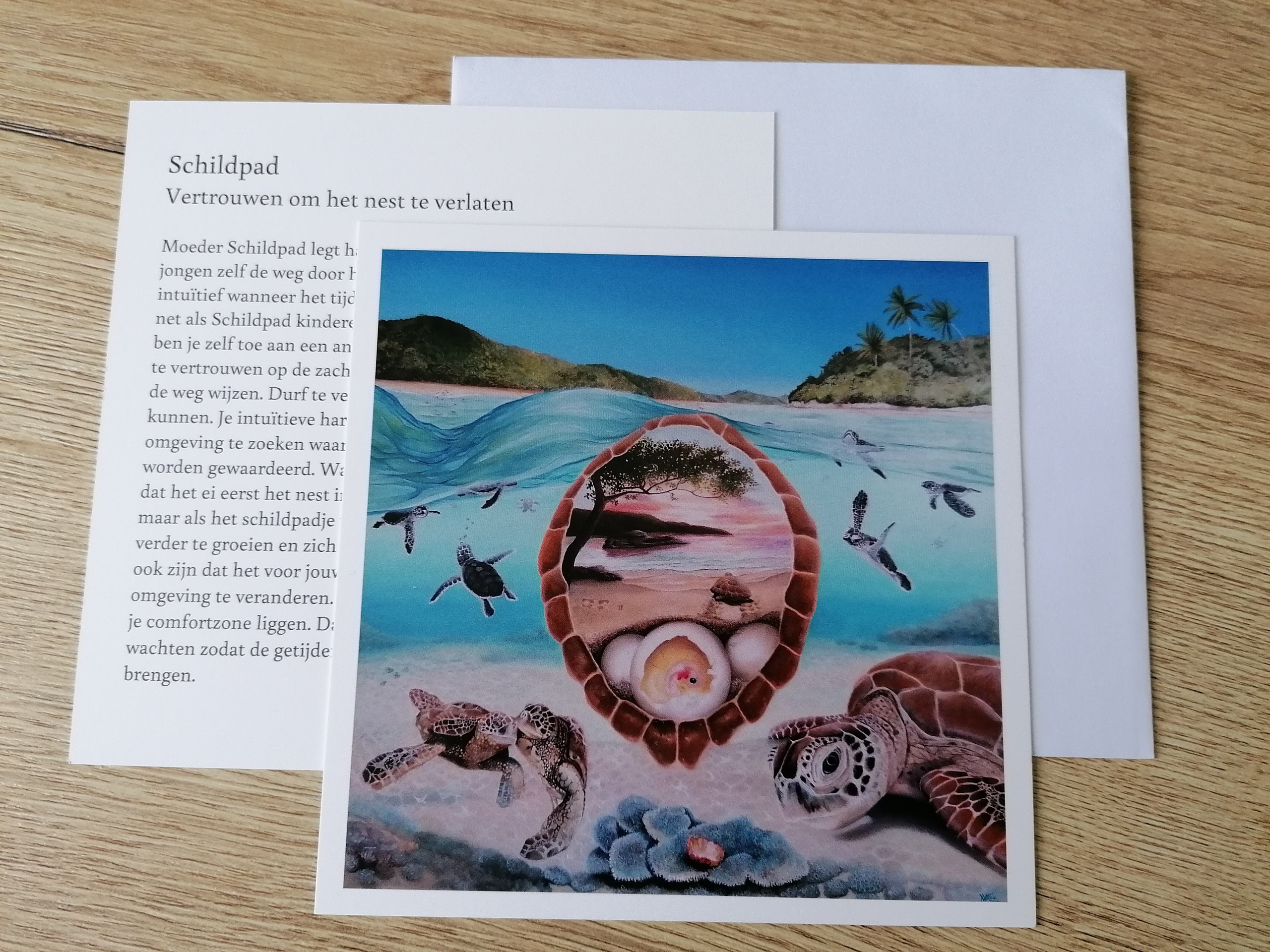 Kunstkaart van olieverf schilderij schildpad "Vertrouwen om het nest te verlaten" 14x14cm. Incl. envelop Ik wil een kunstkaart bestellen Vermeld bij bestellen om welke kunstkaart het gaat, aantal en het adres waar het naar toe gestuurd mag worden. Na overmaking van 7,37 euro (incl verzendkosten) wordt de kaart naar je opgestuurd. Betaalgegevens ontvang je nadat je een mail hebt gestuurd met de bestelling.