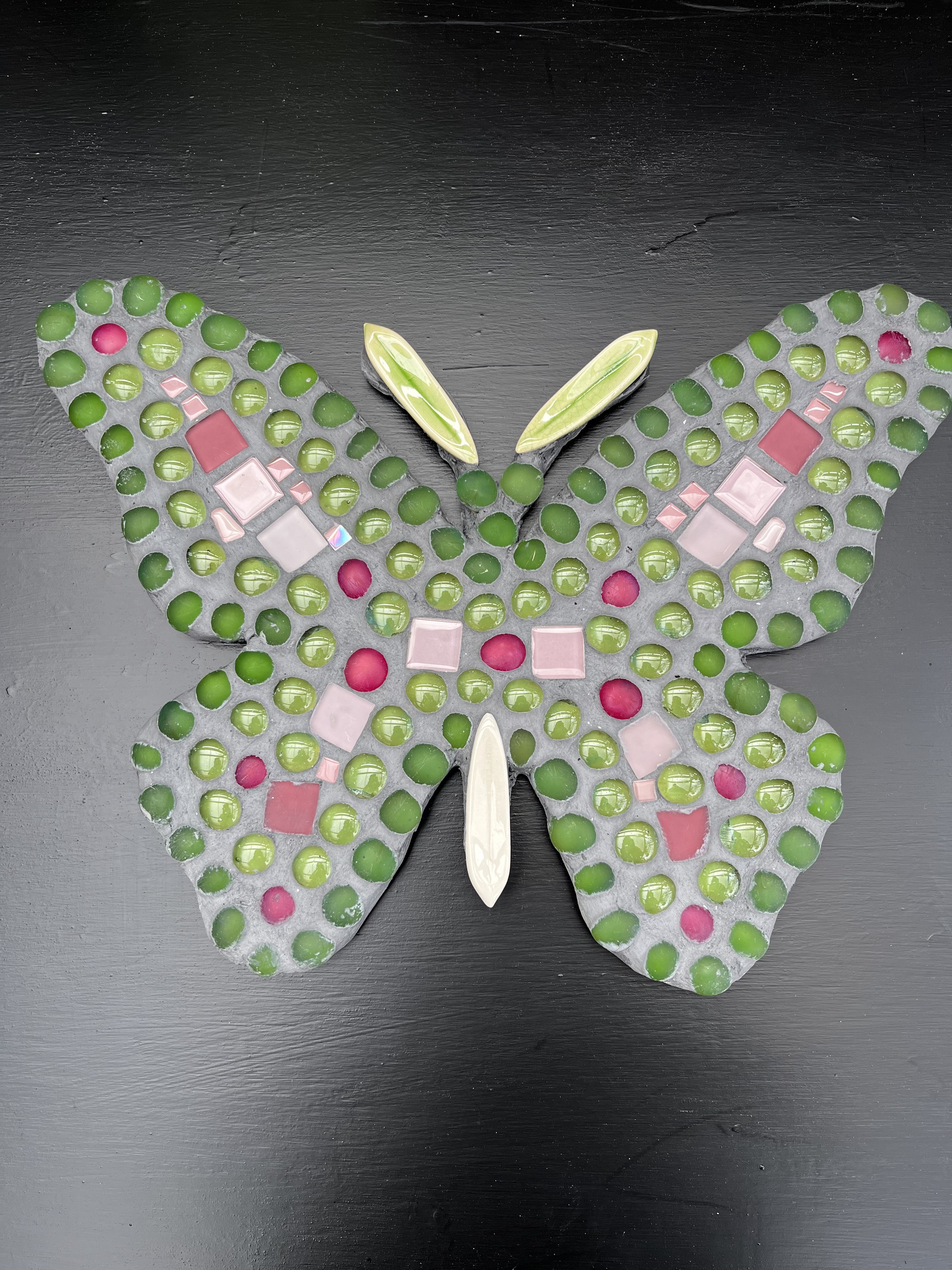 Vlinder op houten ondergrond bewerkt met keramische objecten en glas.