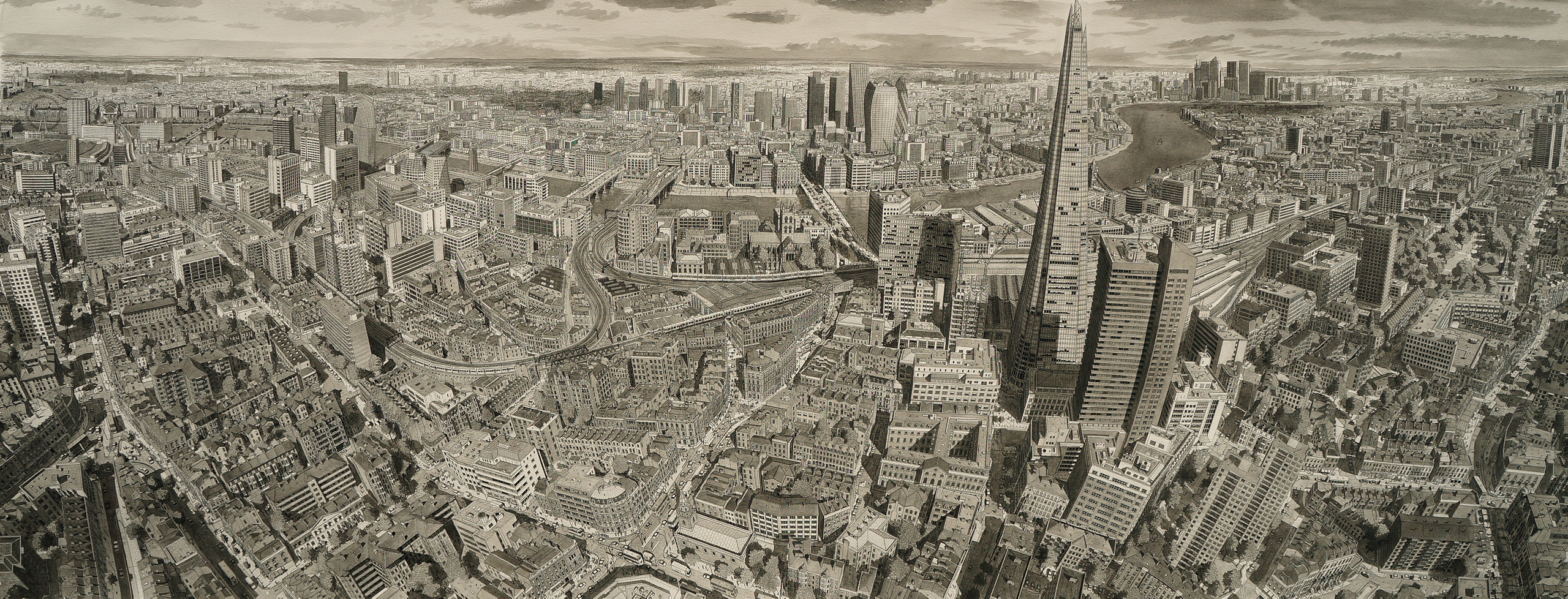Dit panoramische uitzicht op Londen toont welhaast de gehele stad van west naar oost. Vele bekende gebouwen zijn te zien. Om er een paar op te noemen; The London Eye, Tower Bridge, The Shard, Tate Bankside, St. Paul's Cathedral, Southwark Cathedral, Borough Market en in de verte Millennium Dome. Op de voorgrond na heb ik mij grotendeels gebaseerd op de stad zoals deze ook in het echt is. Aan deze tekening heb ik van eind 2019 tot begin april 2024 gewerkt. Het is mijn grootste werk tot nu toe.