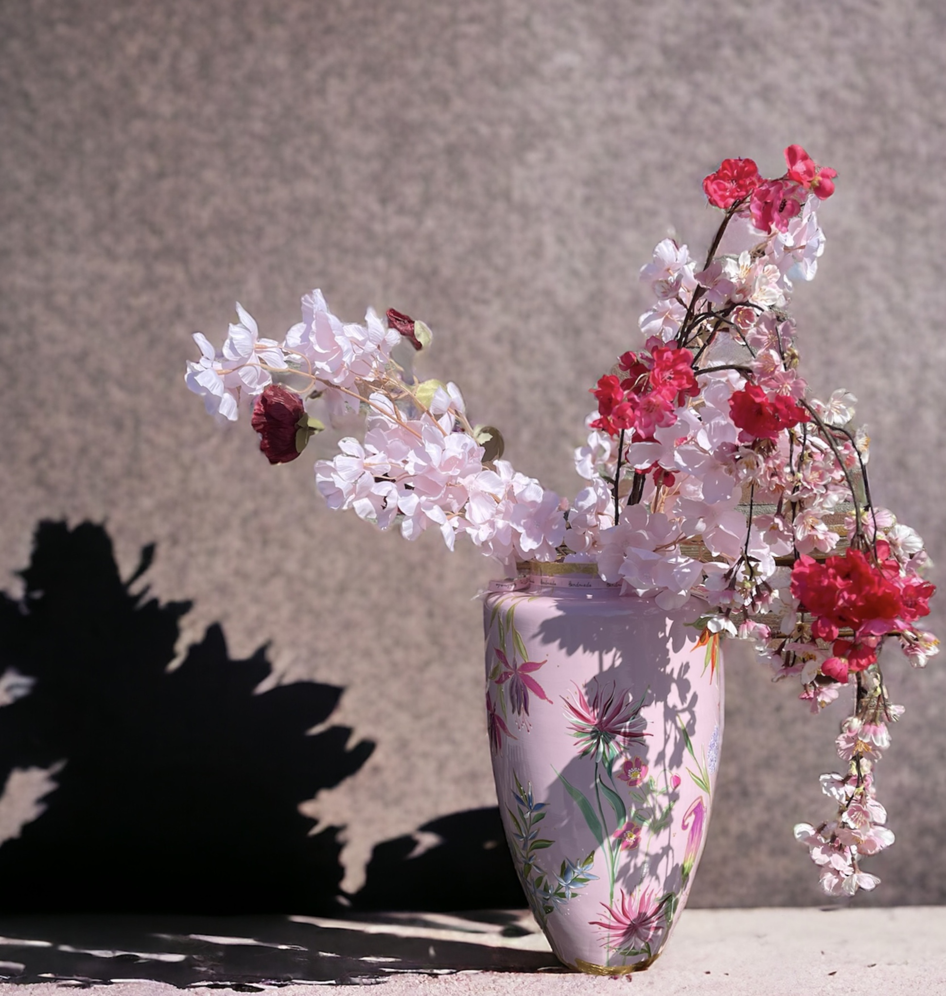 Hoge vaas in zacht roze. Deze vaas staat te koop bij Intens bloemen.