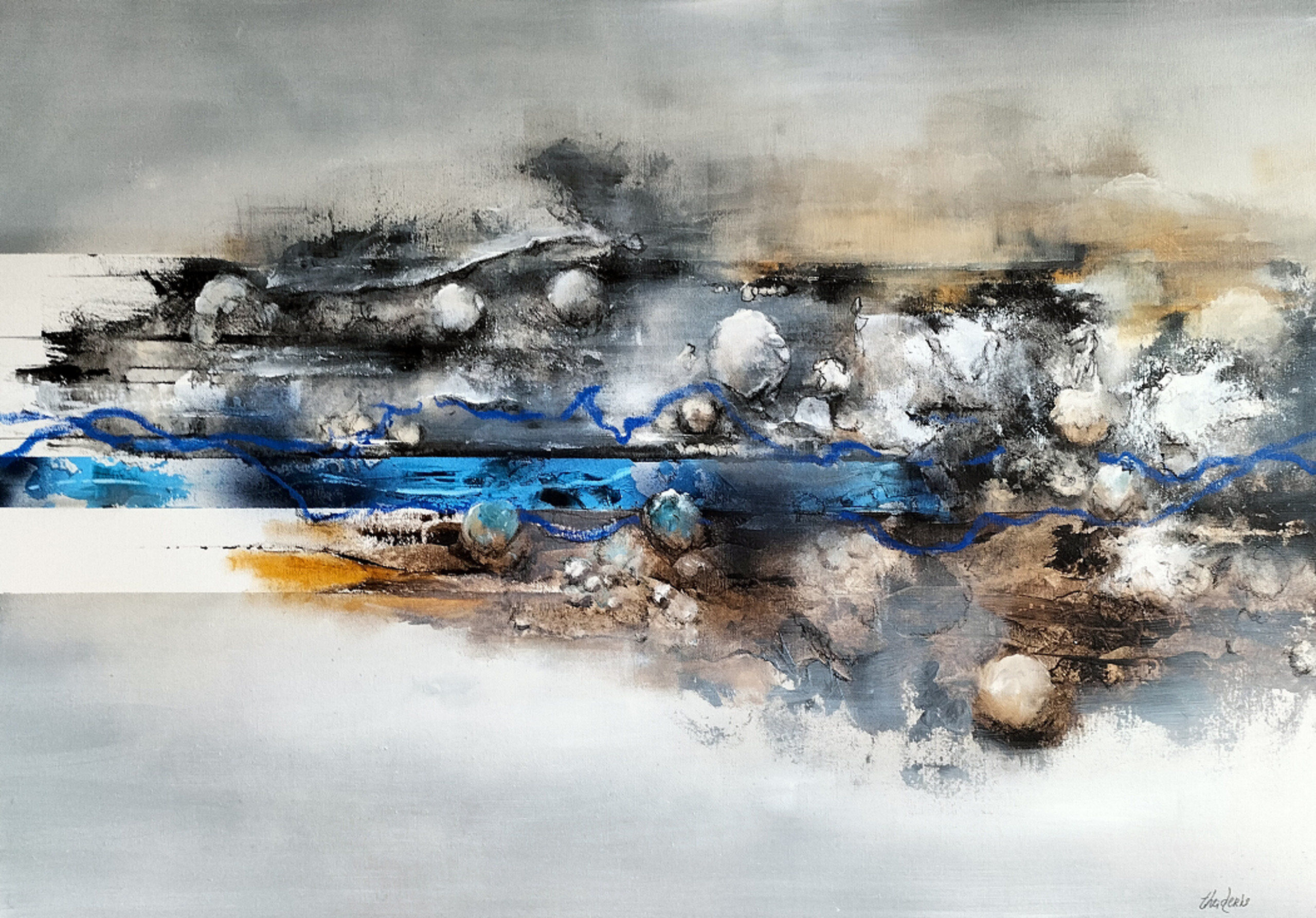 Mixed Media op Canvas 70 x 100 x 2 cm. Exclusief stalen lijst.