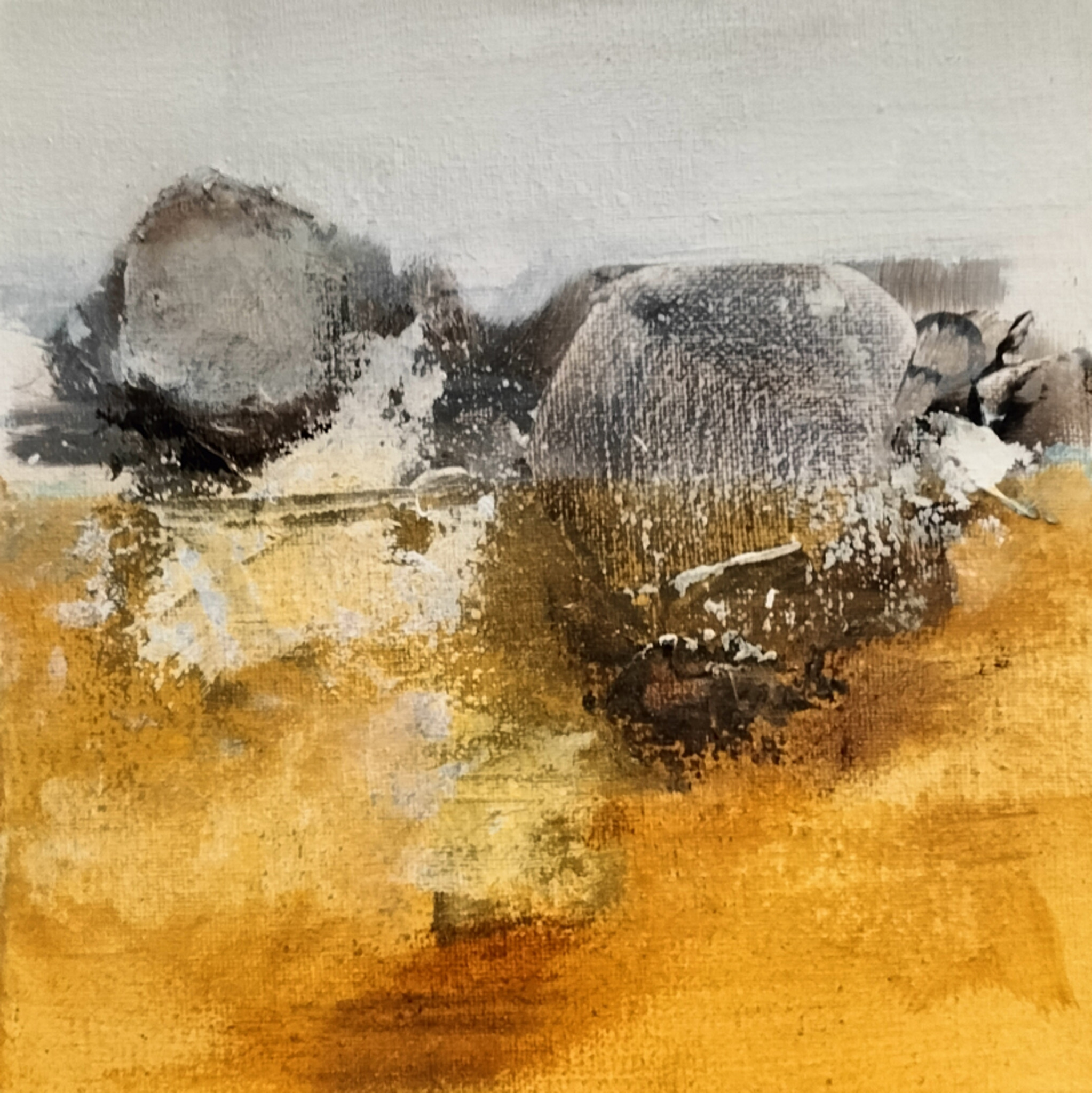 Mixed media 20 x 20 cm. Gemonteerd op stalen plaat van 30 x 30 cm. Gebaseerd op natuurlijke gebeurtenissen en/of taferelen op eigen wijze verbeeld.