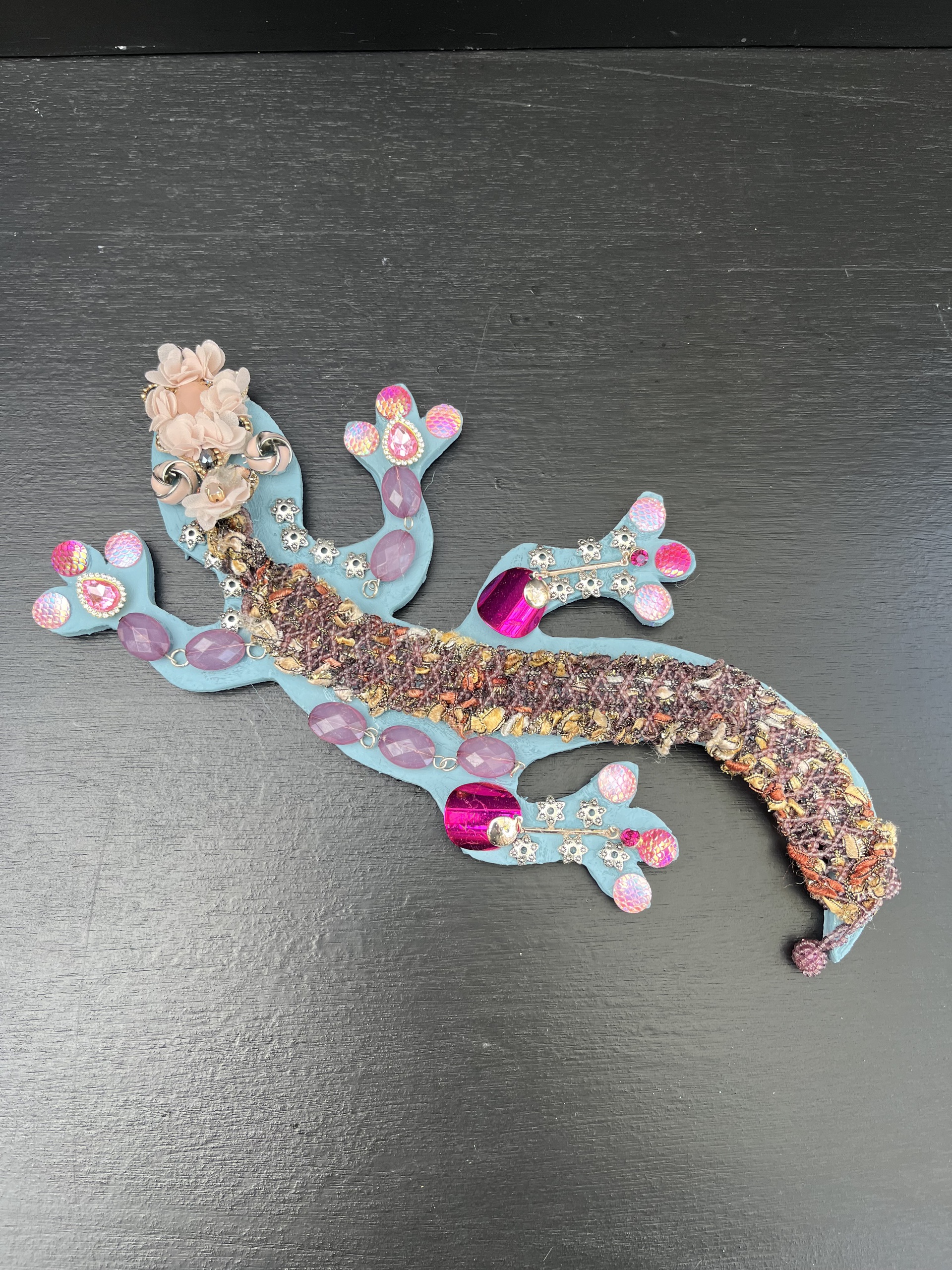 Gekko op blauw houten ondergrond bewerkt met roze sieraden.