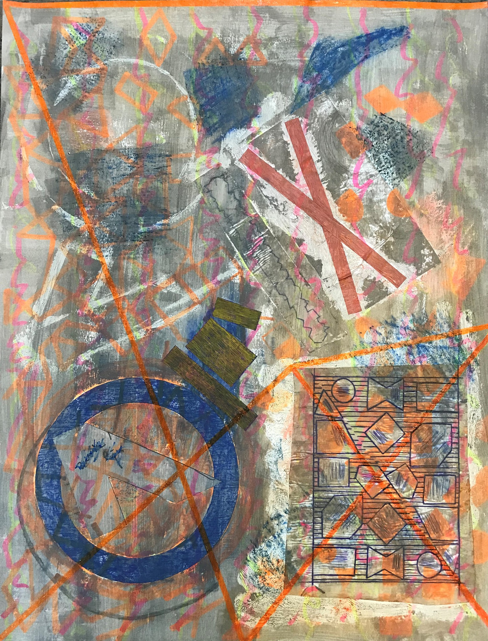 Schildering-collage van Josée Wuyts met typografische elementen,