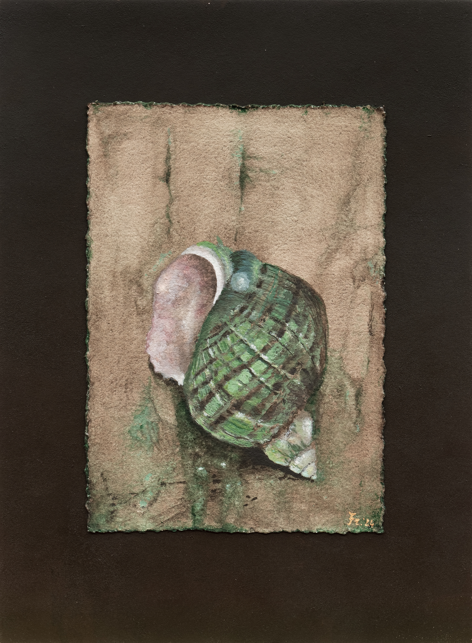Een serie van 3 schilderijen, geschilderd in waterverf op geschept papier, ingelijst in houten lijsten.