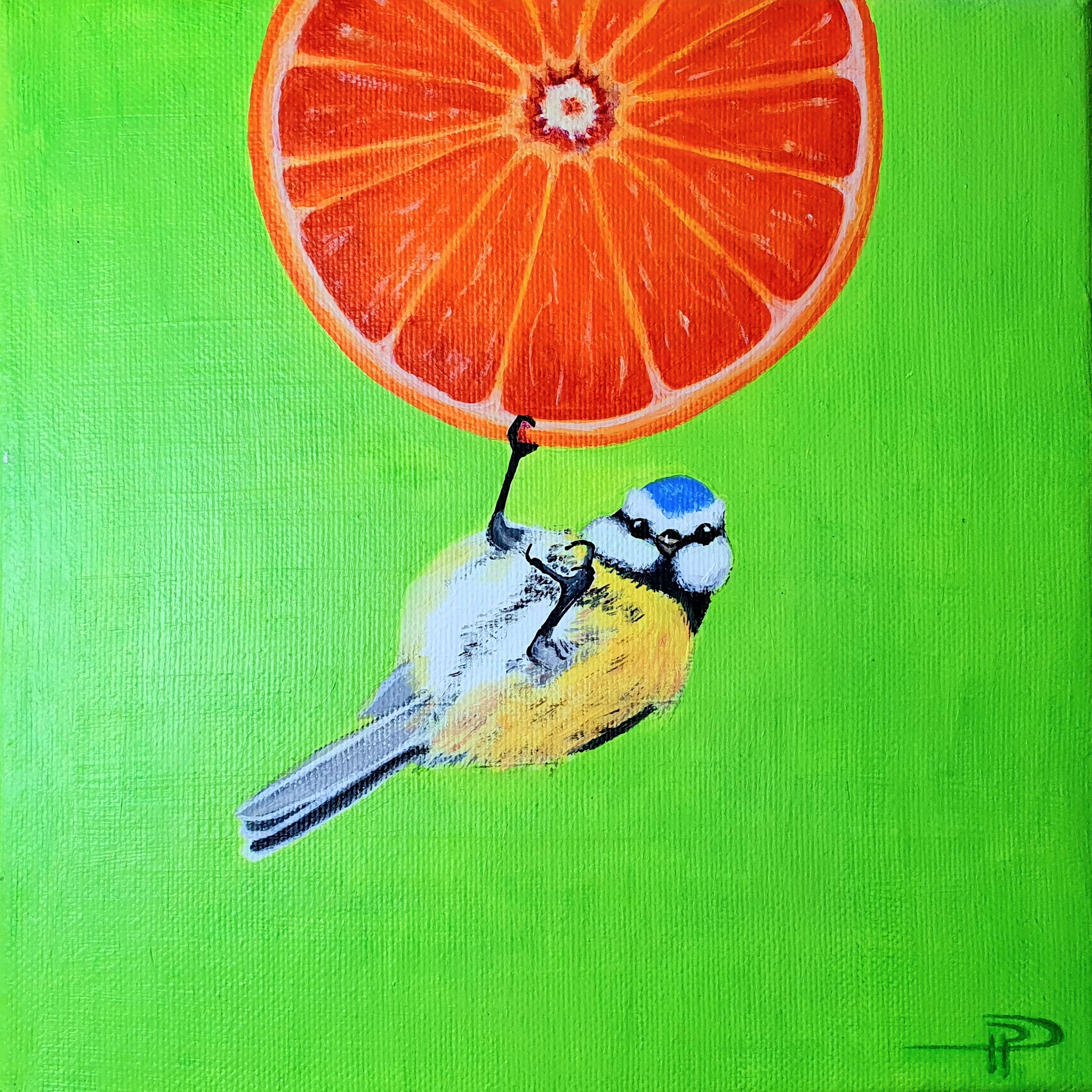 Een sinaasappel is een zoete en smakelijke vrucht met een prachtige kleur. Een Pimpelmees is een vrolijk, klein vogeltje. Ik hoop dat dit schilderij je eraan herinnert om elke dag een beetje vreugde te zoeken. Galaten 5:22: "Maar de vrucht van de Geest is vreugde."