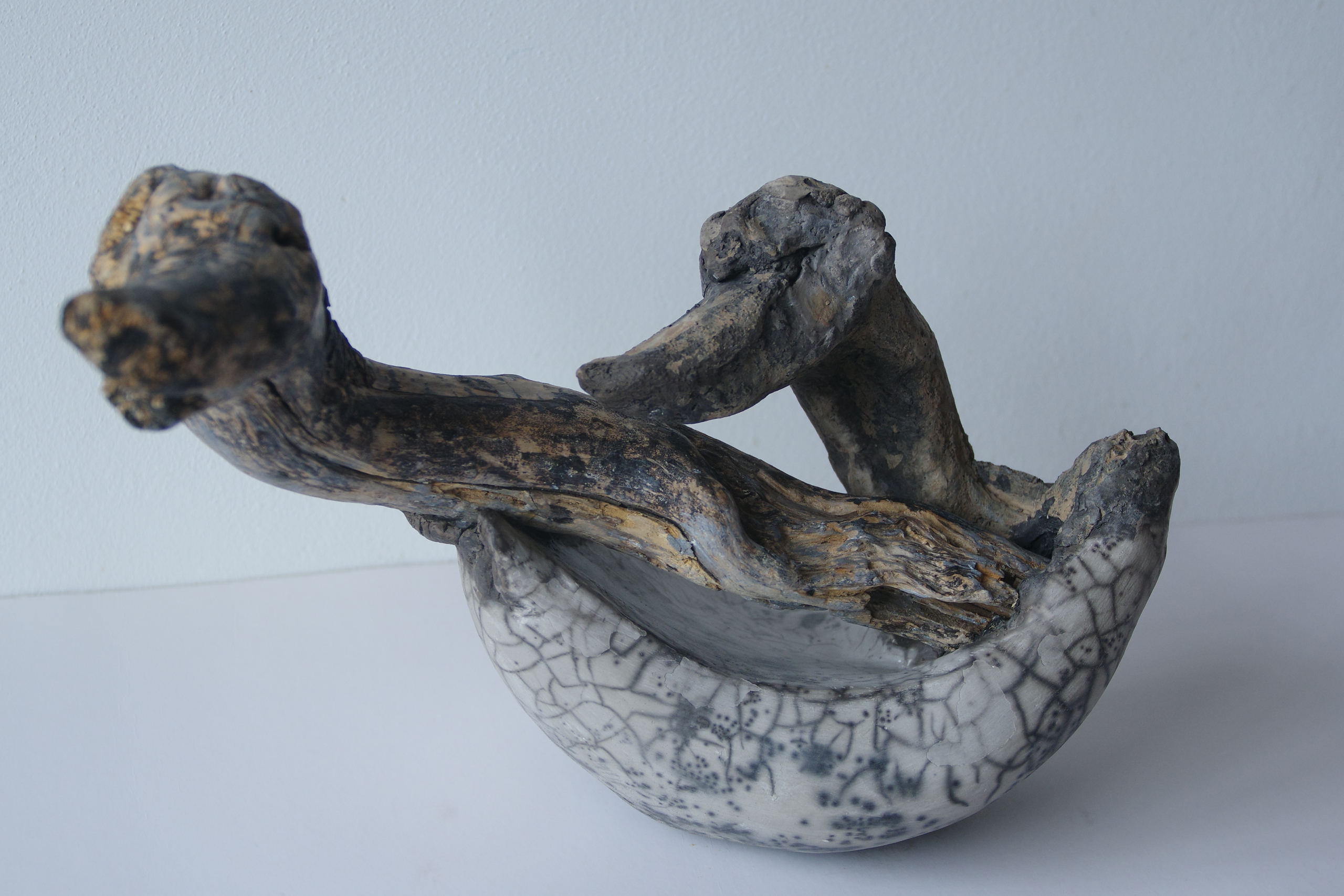 Mijn keramiek is rond, gebogen, zacht en geleidelijk verlopend met verrassende details van laagsgewijs opgebouwde onderdelen die juist speciale aandacht krijgen. Ik laat me uitdagen door het zogenaamde primitieve stoken; pitfire en naked raku.