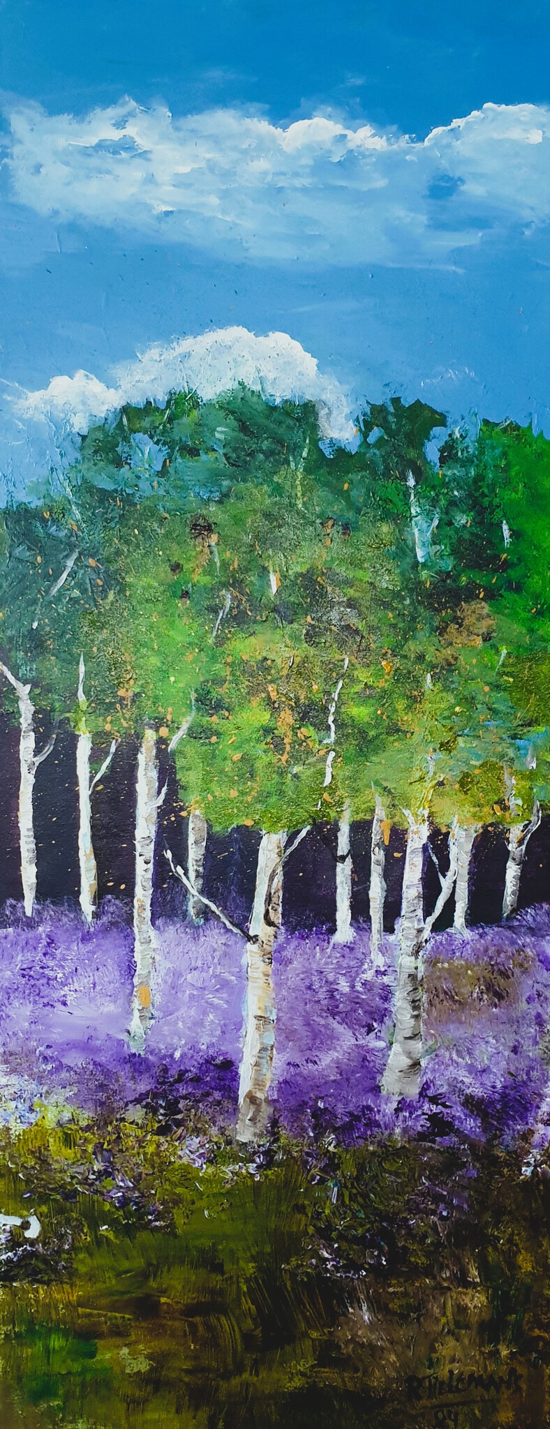 Dit acrylverfschilderij toont een bos van berkenbomen met witte stammen, die scherp contrasteren tegen een kleurrijke achtergrond. ๐ณ De bovenkant van het schilderij heeft een heldere, blauwe lucht met zachte, witte wolken. โ๏ธ De bomen hebben volle, groene bladeren die het frisse bladerdak vormen, en daaronder bevinden zich paarse rododendronstruiken in volle bloei, die een levendige uitstraling aan het schilderij geven. ๐ธ De voorgrond heeft enkele nuances van groen en aarde, waardoor een natuurlijke overgang naar de paarse bloeiende struiken ontstaat. ๐ Het schilderij straalt een serene en kleurrijke sfeer uit, die de rust en schoonheid van een zomers berkenbos vastlegt. ๐จ Kunstprinten van dit werk zijn ook verkrijgbaar op: https://www.werkaandemuur.nl/nl/shopwerk/Berkenbos/1466175/132?mediumId=1&size=35x90&var2=0&var3=2