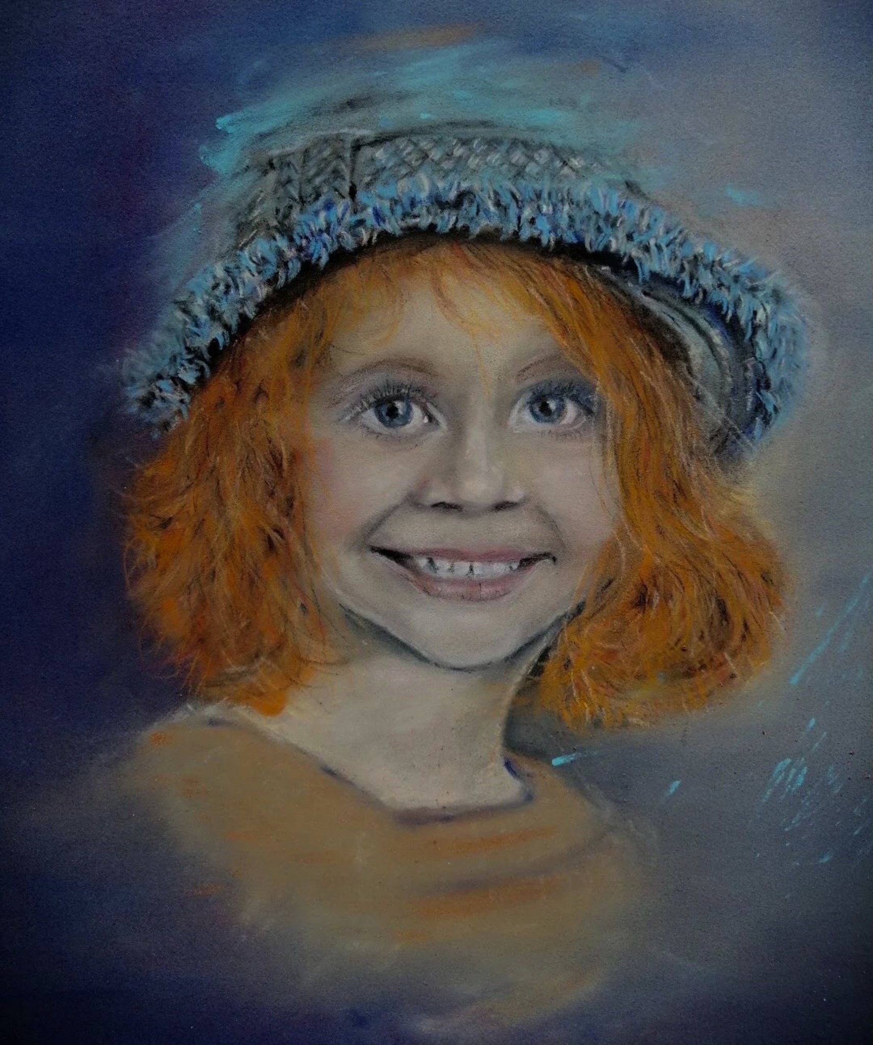 Pastelportret op pastelmat. (25x25) Incl. oranjebruine lijst in dezelfde kleur van het haar.