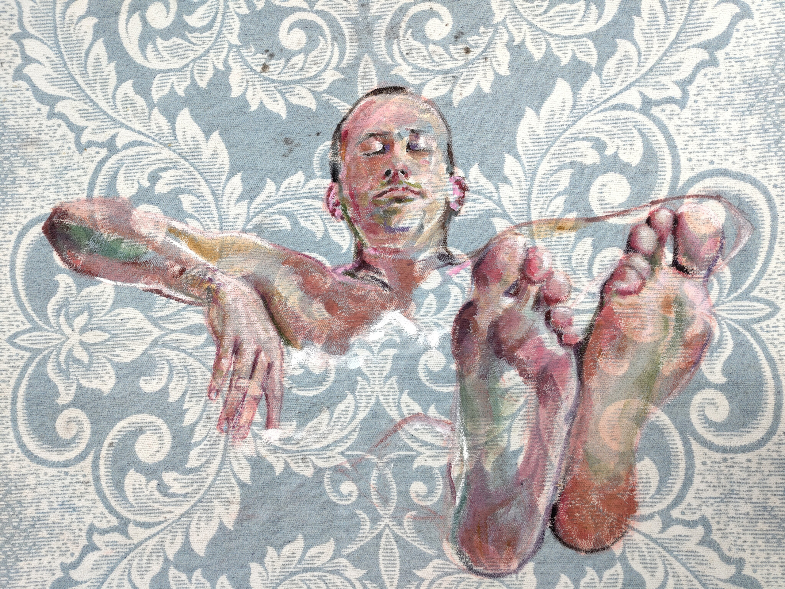 "Baden" is gemaakt voor het kunstproject Feest van de Geest. Het is een verbeelding van één van de zeven bronnen van troost volgens Thomas van Aquino; een bad nemen. Voor de expositie heb ik deze zeven bronnen geschilderd op oude dekens. Dekens zijn warm en troostrijk. De dekens hebben ongetwijfeld al veel meegemaakt en veel troost gebracht.