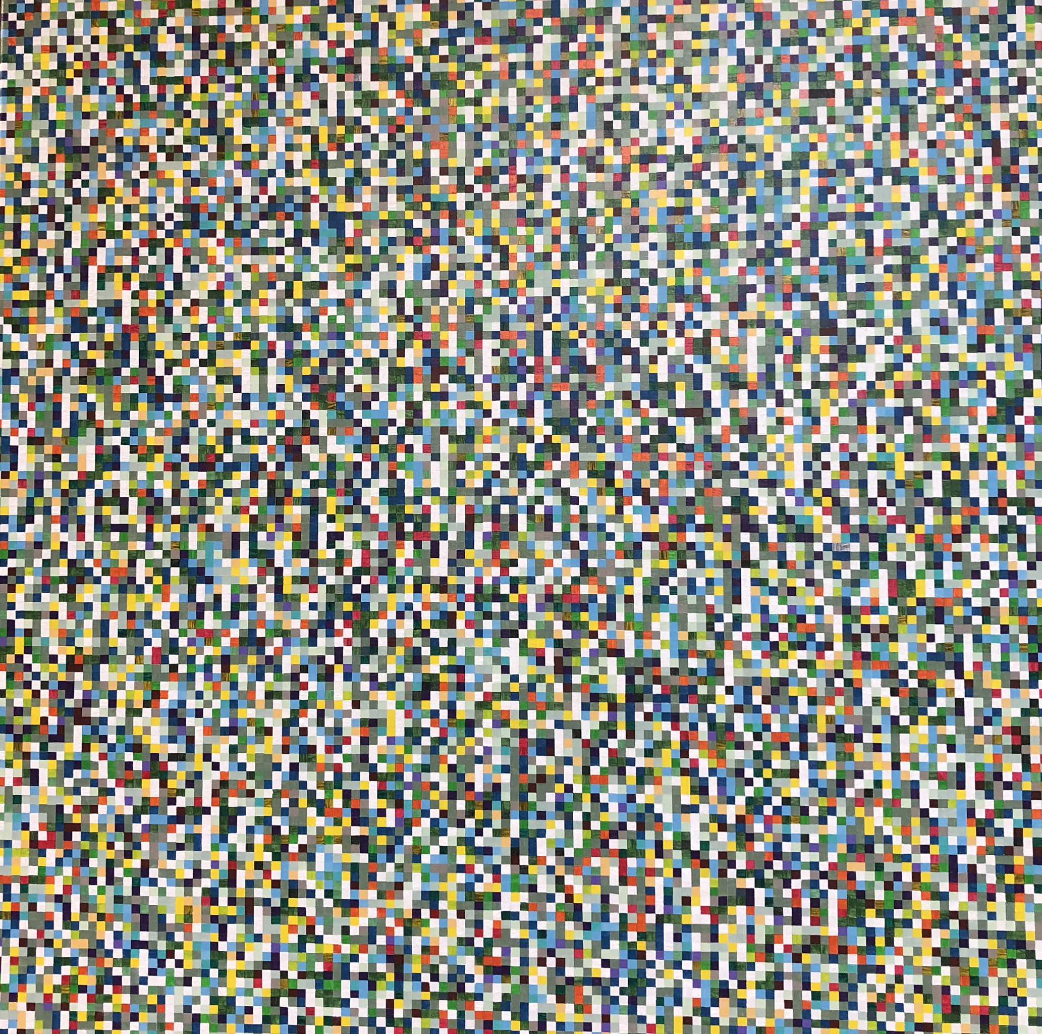 Thema: Chaos (Geometrische Chaos) Mijn kunst is beïnvloedt door de moderne wiskundige en wetenschappelijke benadering van het begrip complexe orde van de natuur. Met name heb ik me verdiept in de Chaos theorie en de fractal geometrie. Ik ben geen wiskundige, en ik gebruik geen wiskundige formules. De ideeën van de Chaos theorie en fractal geometrie leiden tot de ontwikkeling van de composities in mijn werk. Ik gebruik driehoeken,vierkanten en cirkels in mijn schilderijen, maar in mijn huidige serie, geoChao richt ik me alleen op de vierkanten en de verhoudingen tussen de vierkanten. Ik ontwikkel mijn composities door kleine vierkantjes op grote te zetten of grote op kleine te zetten. Het gaat om de onderlinge verhoudingen tussen de vierkanten. Ik laat de methode die ik kies de compositi
