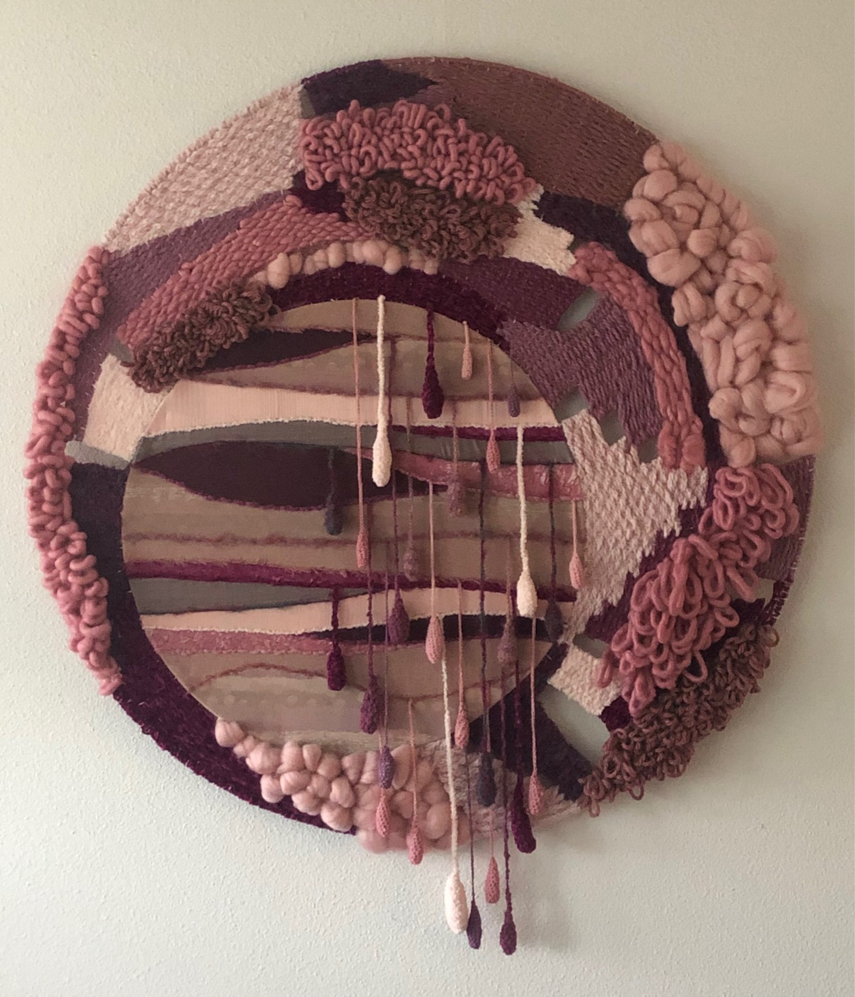 Dit wandkleed heb ik gemaakt voor de tentoonstelling "het feest van de Geest" 2024 in Zoetermeer met het thema troost. De kleur roze symboliseert liefde, tederheid, zachtmoedigheid en genegenheid. Deze kleur ondersteunt je bij het verwerken van pijn en verdriet. Vandaar mijn keuze om een werk in de kleur roze te maken. De basis is met de naaimachine genaaid textiel omgeven door een weefwerk (aanraking, omarming ) van wol.