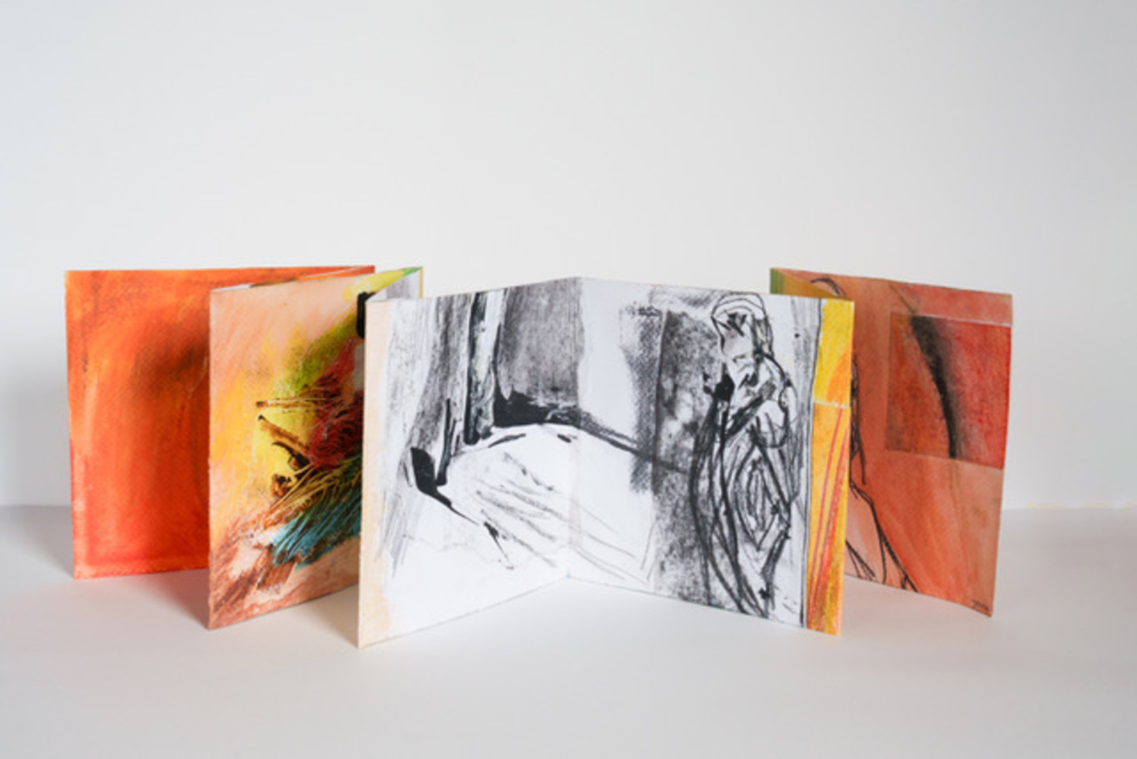 Papier in leperello-vorm gevouwen. Gebruik gemaakt van gemengde technieken, bewerkt met collage, acrylverf, oliepastel, houtskool, ecoline, softpastel, .