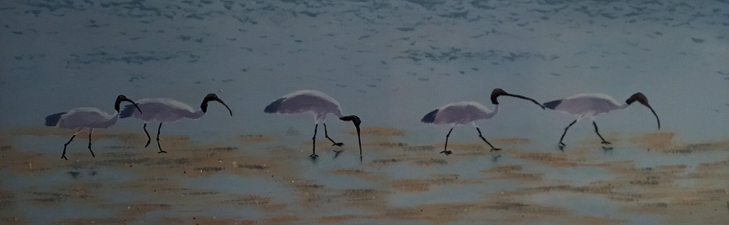 Ibissen fourageren op het wad