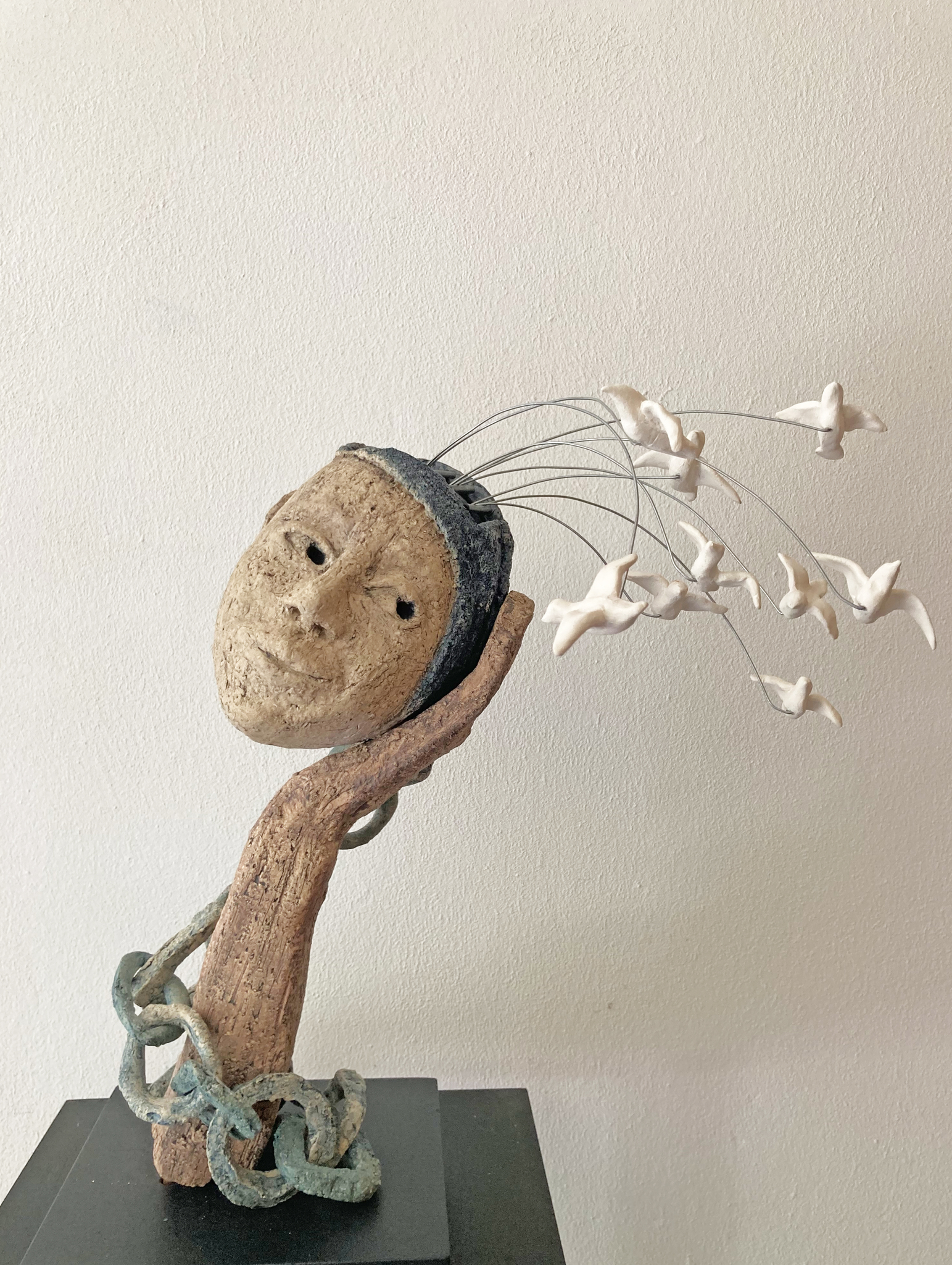 Klei, grof, gevormd, geduwd, geschraapt. Ruwe huid, schrale kleur en soms gecombineerd met metaal. Hiermee kan ik mijn ideeën en gedachten verbeelden. Mijn beeld vertelt, de kijker luistert.