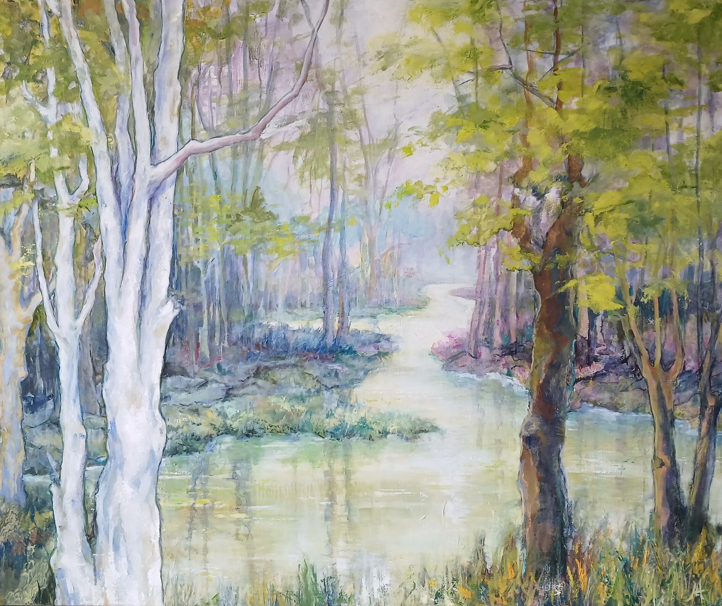 Een sereen landschap met bomen en water, waar op de voorgrond een witte boom door vorm en kleur extra opvalt.