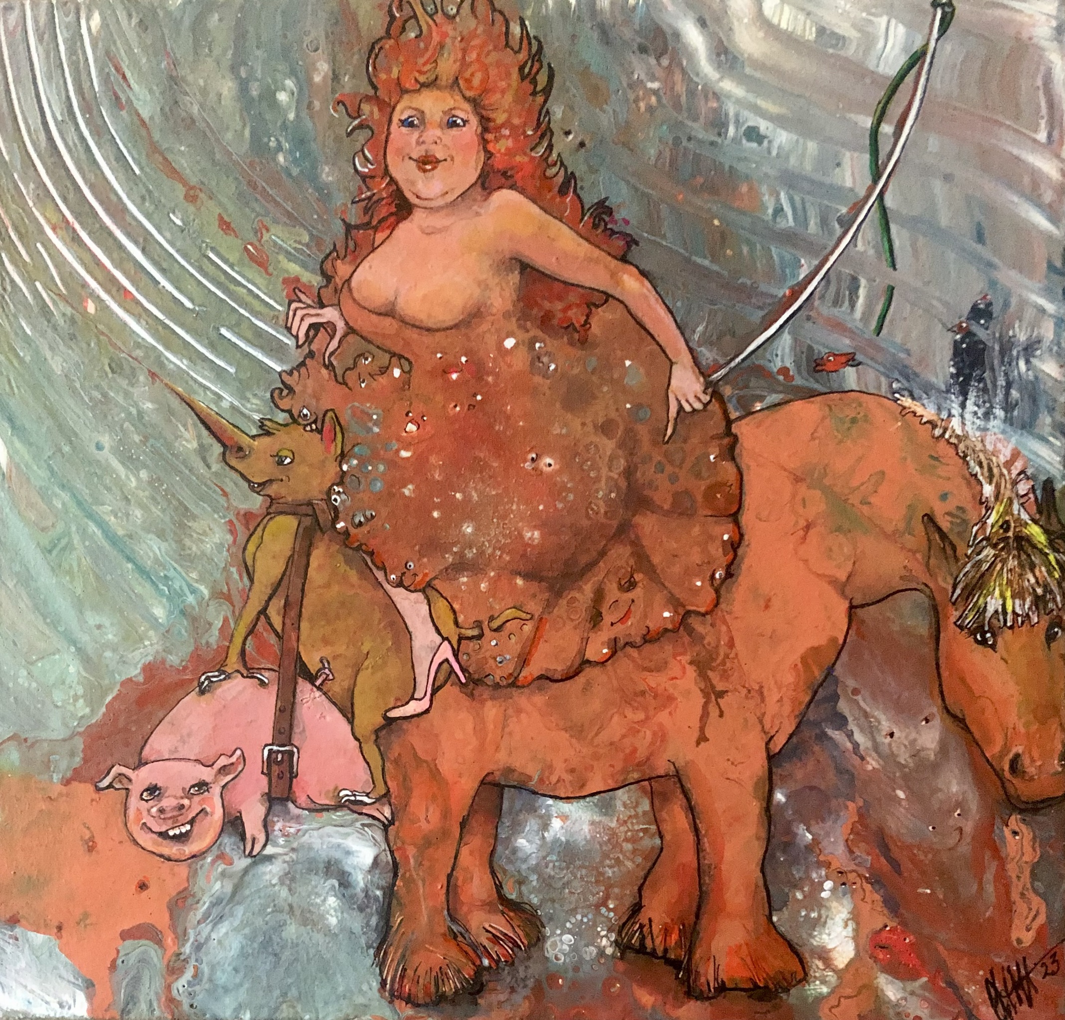 Ondergrond met de pouring techniek. Door de figuren in het schilderwerk gaat mijn fantasie aan de gang. Wat ik zie ga ik verder uitwerken. Vuurvrouw is op paneel geschilderd met acryl.
