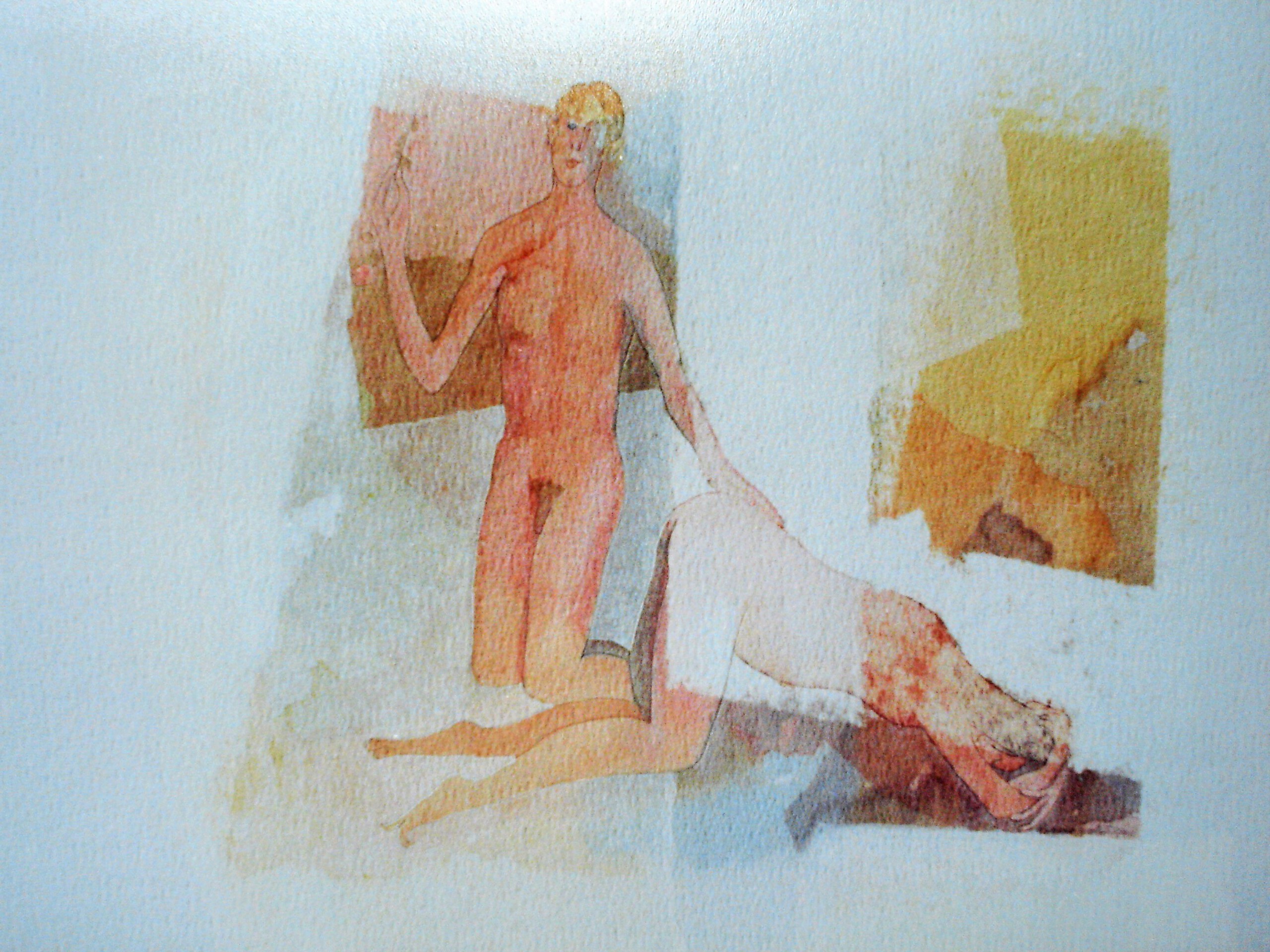 Ongeklede figuren in een abstraherende interieur (Hommage aan Jeroen Bosch)