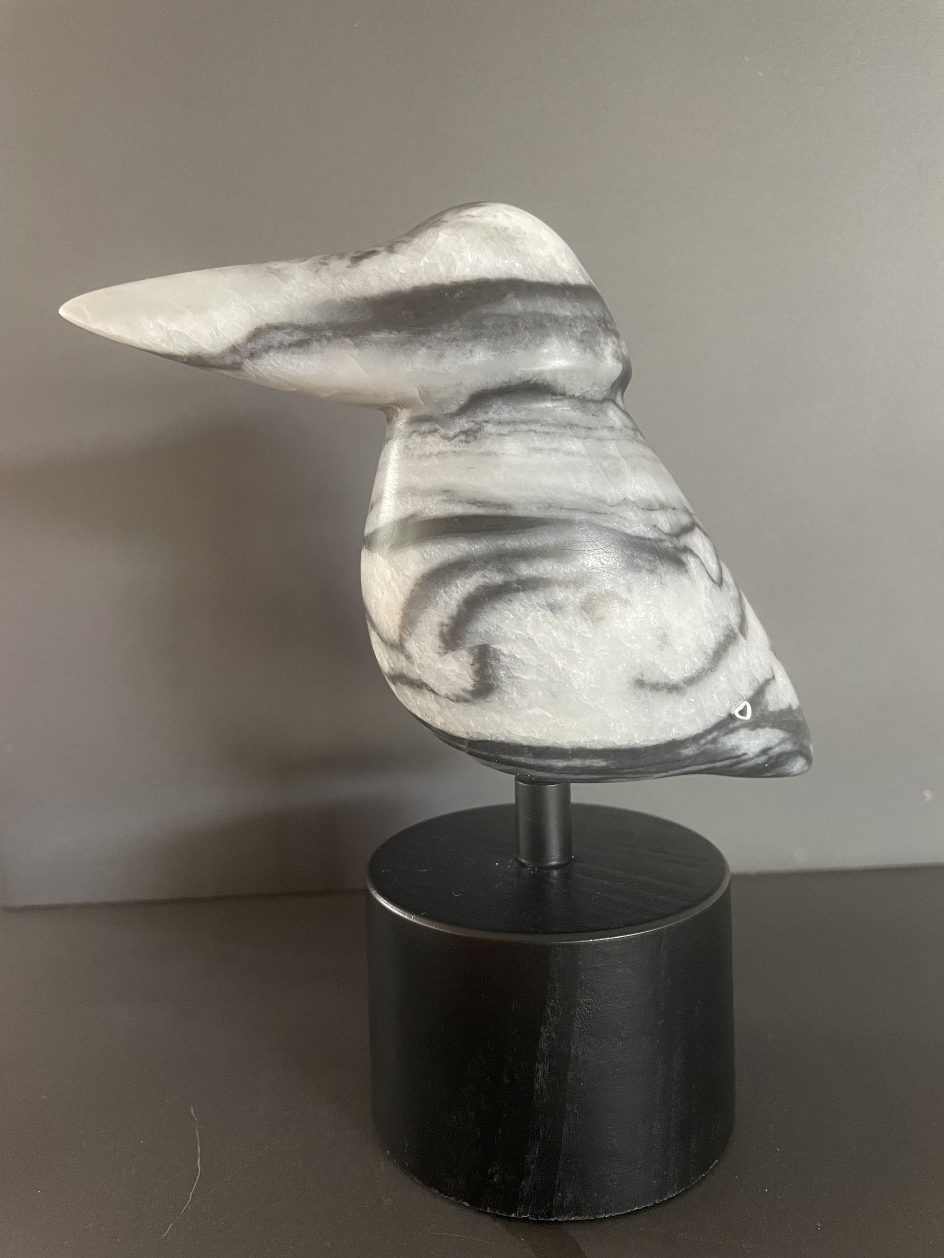 zwart/wit geleurd ijsvogeltje op houten sokkel