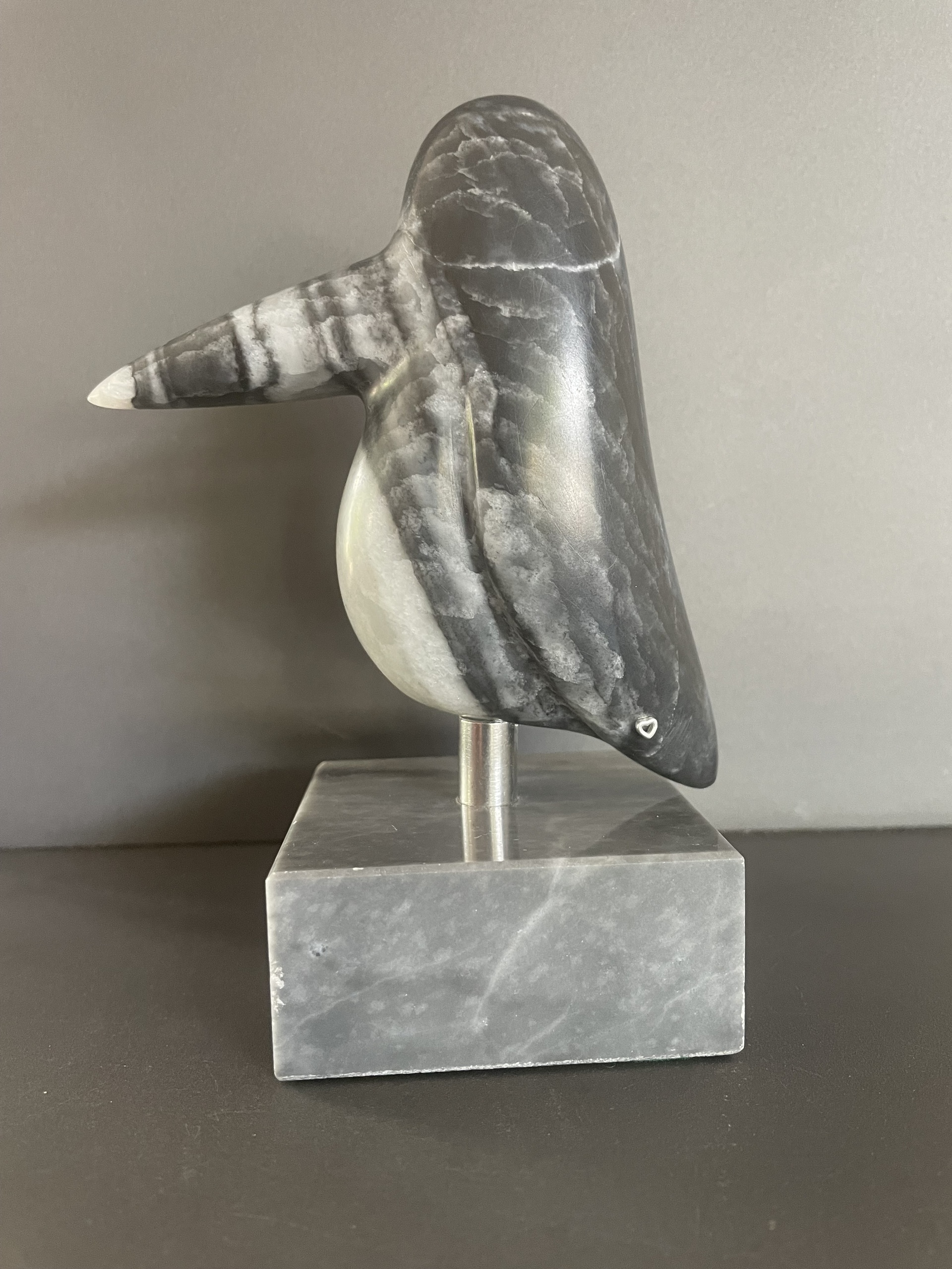 mooi van zwart/wit Afrikaans speksteen gemaakt ijsvogeltje op sokkel van grijs gemêleerd marmer