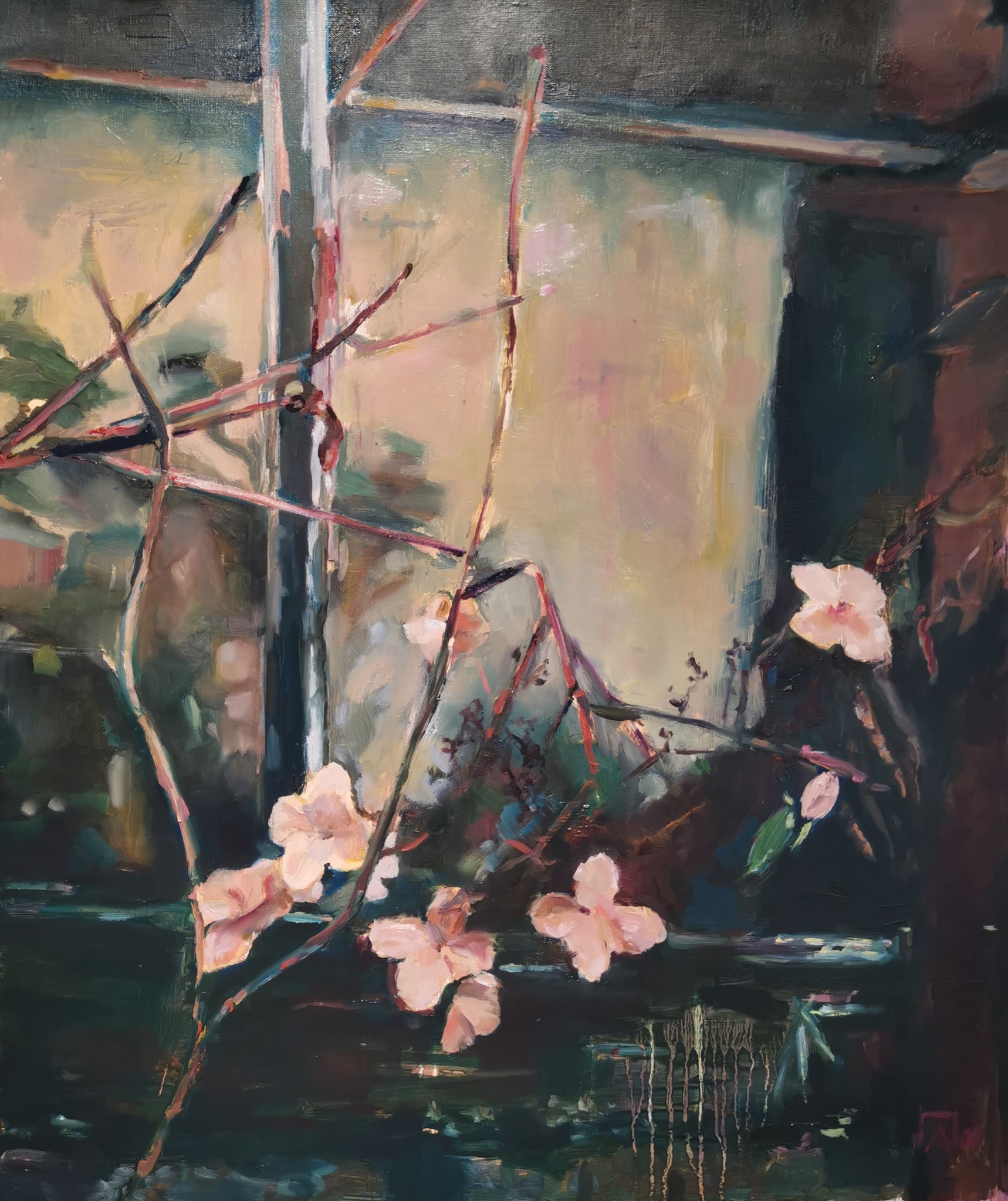Van binnen naar buiten kijken staat centraal. Daarbij een focus op het verkennen van de diepte van kleur en de kunst van het expressief vastleggen van licht op doek.