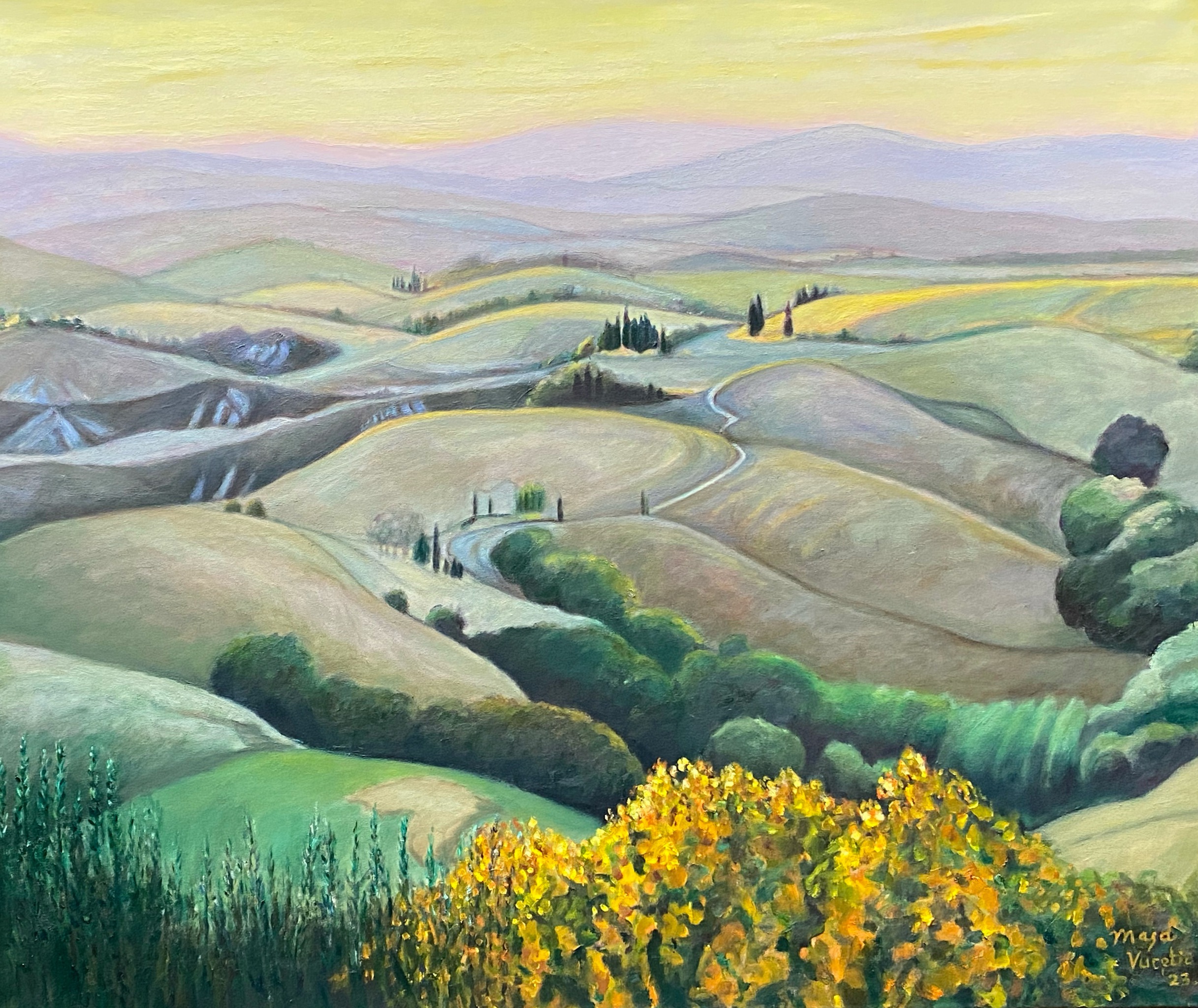 Zachte kleuren na zonsondergang, versterken de zachte glooing van de typische Toscaanse heuvels