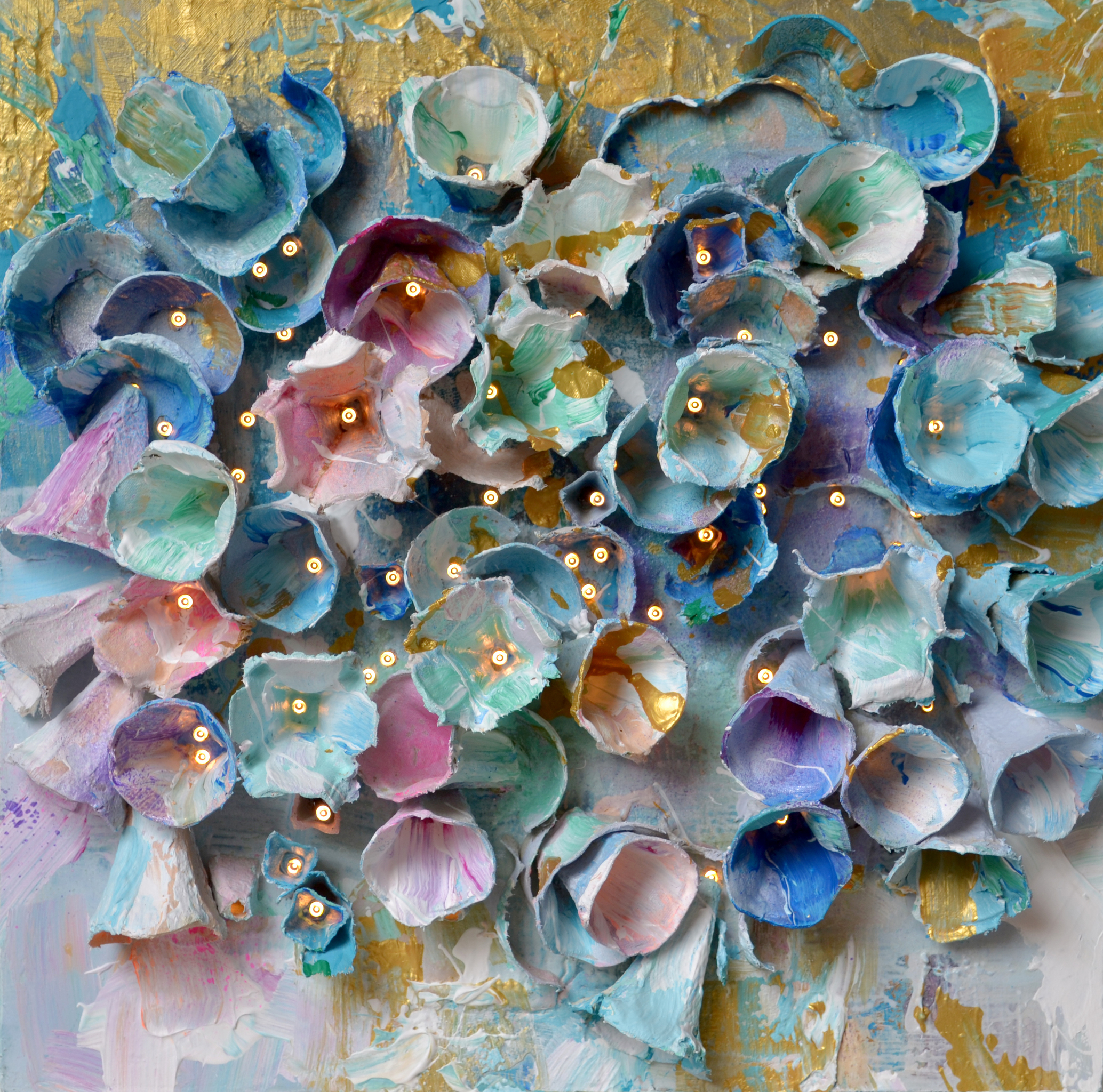 "Blue Flowers" is a captivating 3D art piece featuring delicately sculpted papier-mâché flowers adorned with paint, emitting a gentle glow in darkness. Embedded LED lights, strategically placed through slender apertures, can be programmed on a timer, casting a serene ambiance for six hours each evening. Inspired by the enchanting moon flowers, this artwork is a luminous ode to extending the warmth of daylight into our homes during the longer, darker nights. Perfect for creating a cozy and meditative atmosphere, especially as the days grow shorter.