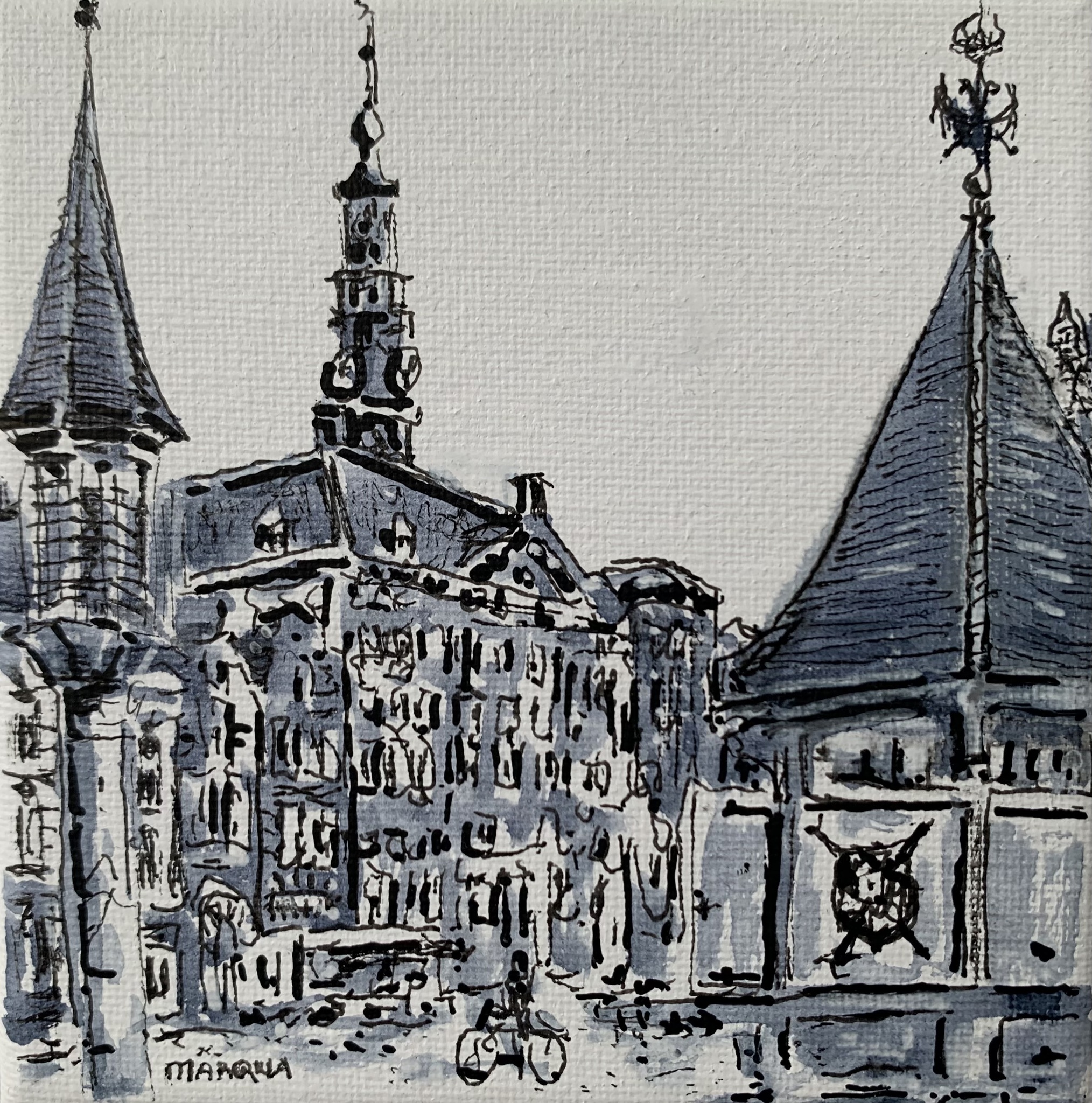 Bossche stadhuis, Mariabeeld en Puthuis, getekend en geschilderd in inkt op doek 10x10 cm. Zwart-wit en paynes grey (blauw/grijs).