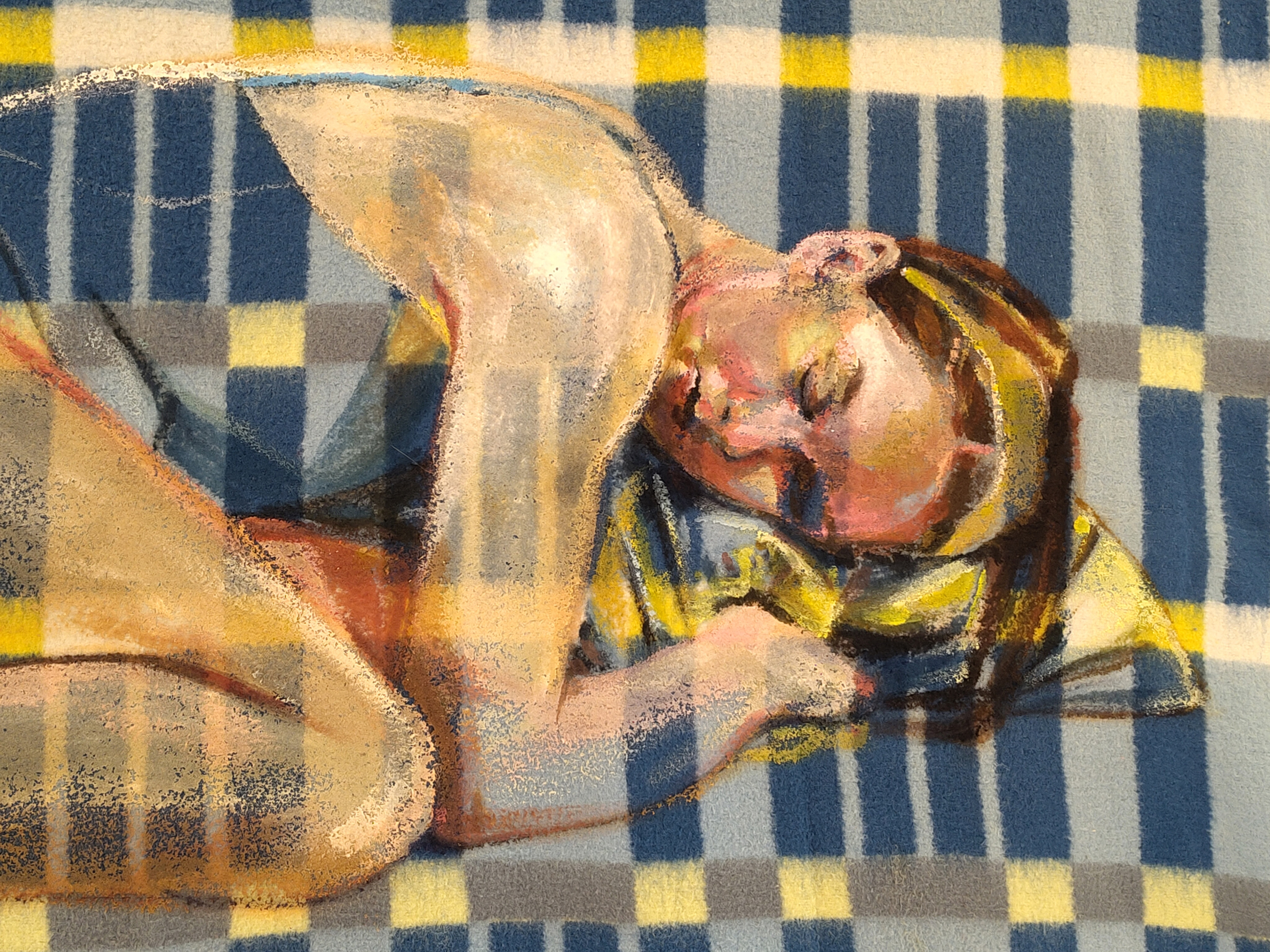 "Slapen" is gemaakt voor het kunstproject Feest van de Geest. Het is een verbeelding van één van de zeven bronnen van troost volgens Thomas van Aquino; huilen / tranen. Voor de expositie heb ik deze zeven bronnen geschilderd op oude dekens. Dekens zijn warm en troostrijk. De dekens hebben ongetwijfeld al veel meegemaakt en veel troost gebracht.