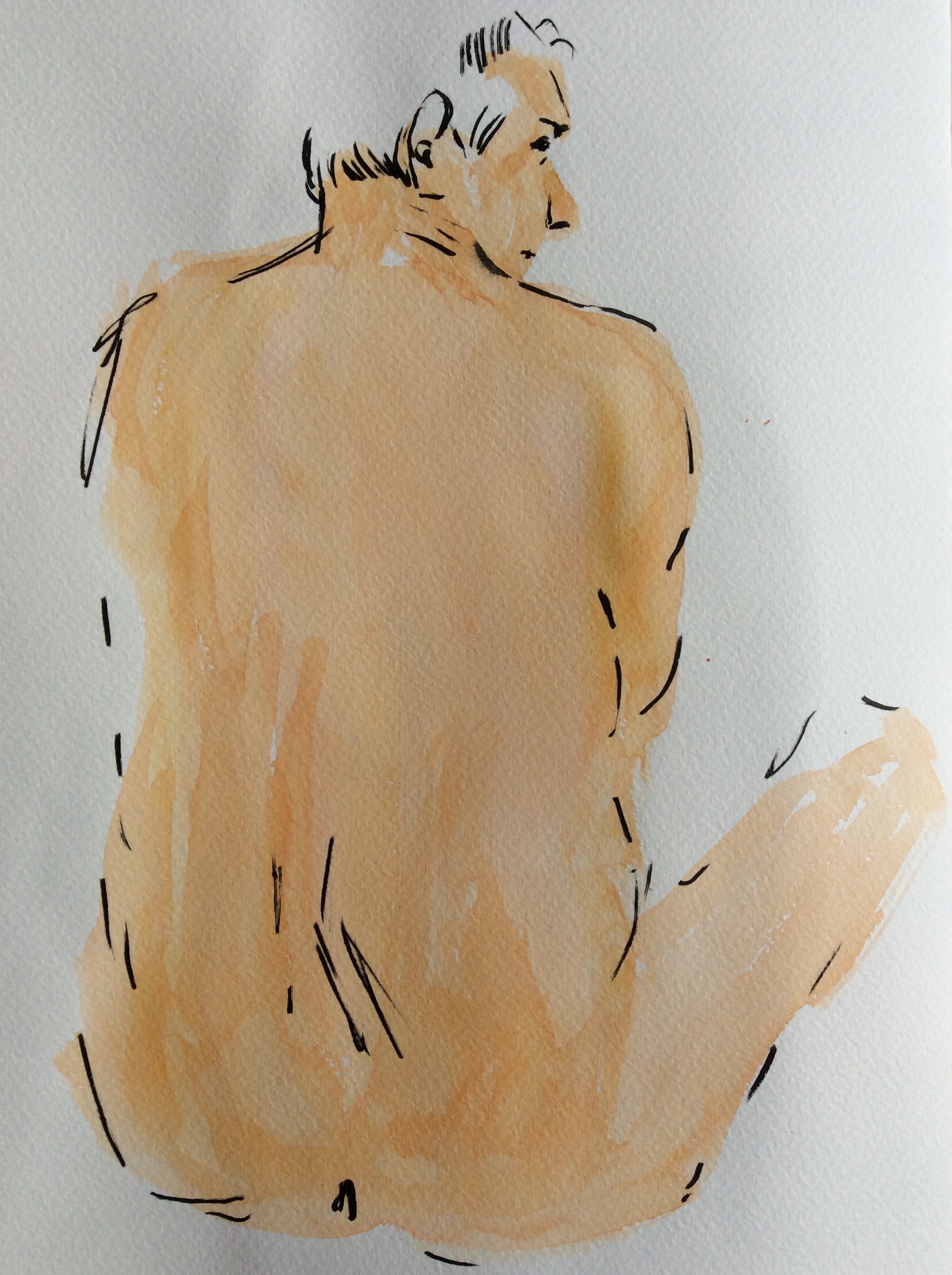 Naakte man op rug gezien in aquarel en inkt