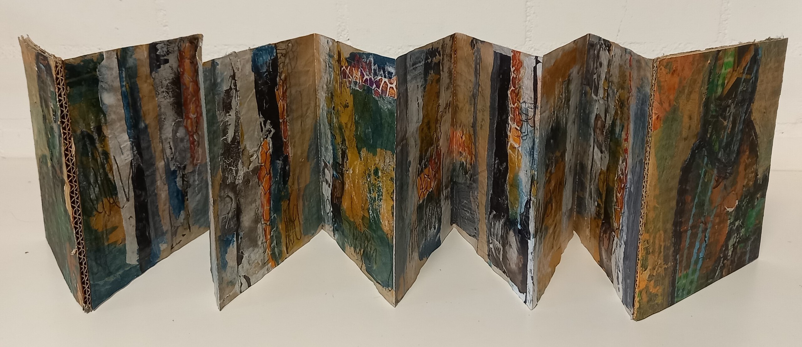 papier in leporellovorm gevouwen met kaft. Gemengde technieken met portretten monotype, acrylverf, houtskool en softpastel