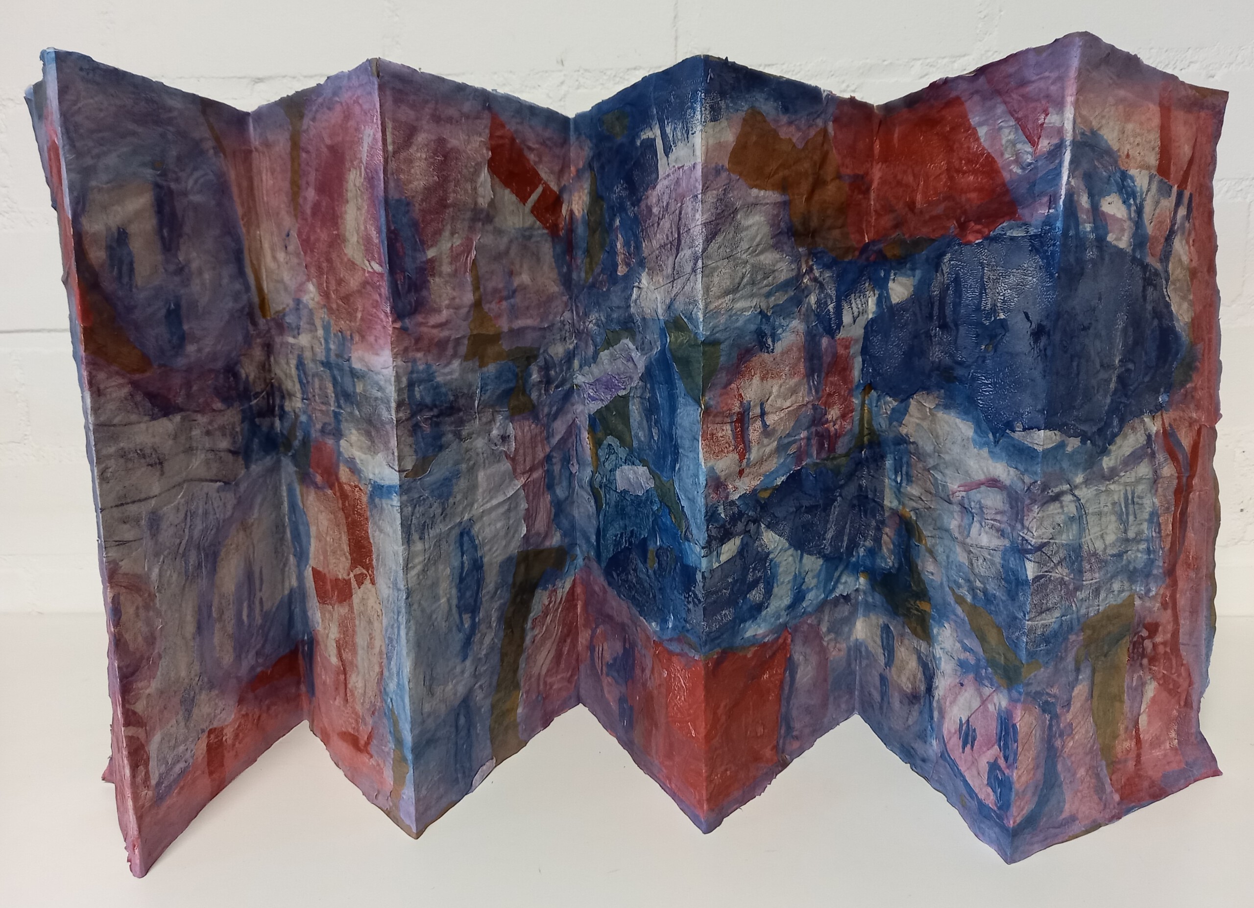 Papier in leporellovorm gevouwen, collage van touchdrawing portretten met extra geschilderde portretten
