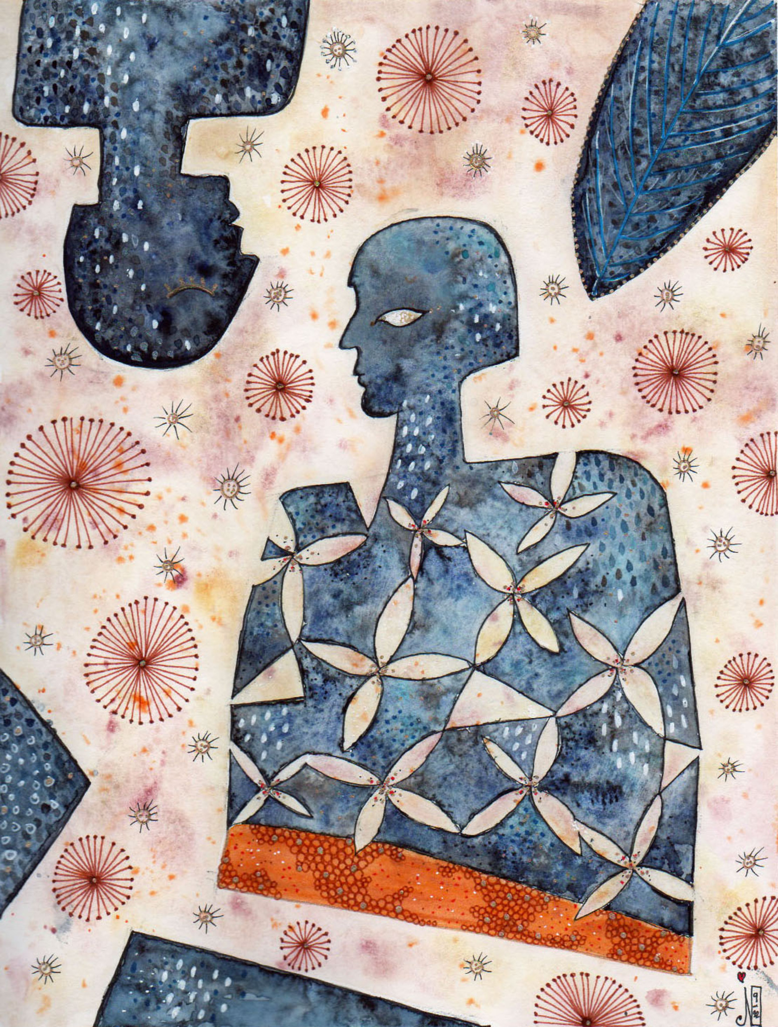 Geabstraheerd werk met aquarel en mixed media. Een werk dat gaat over de schaduwkanten van je als persoon, als mens in de samenleving.
