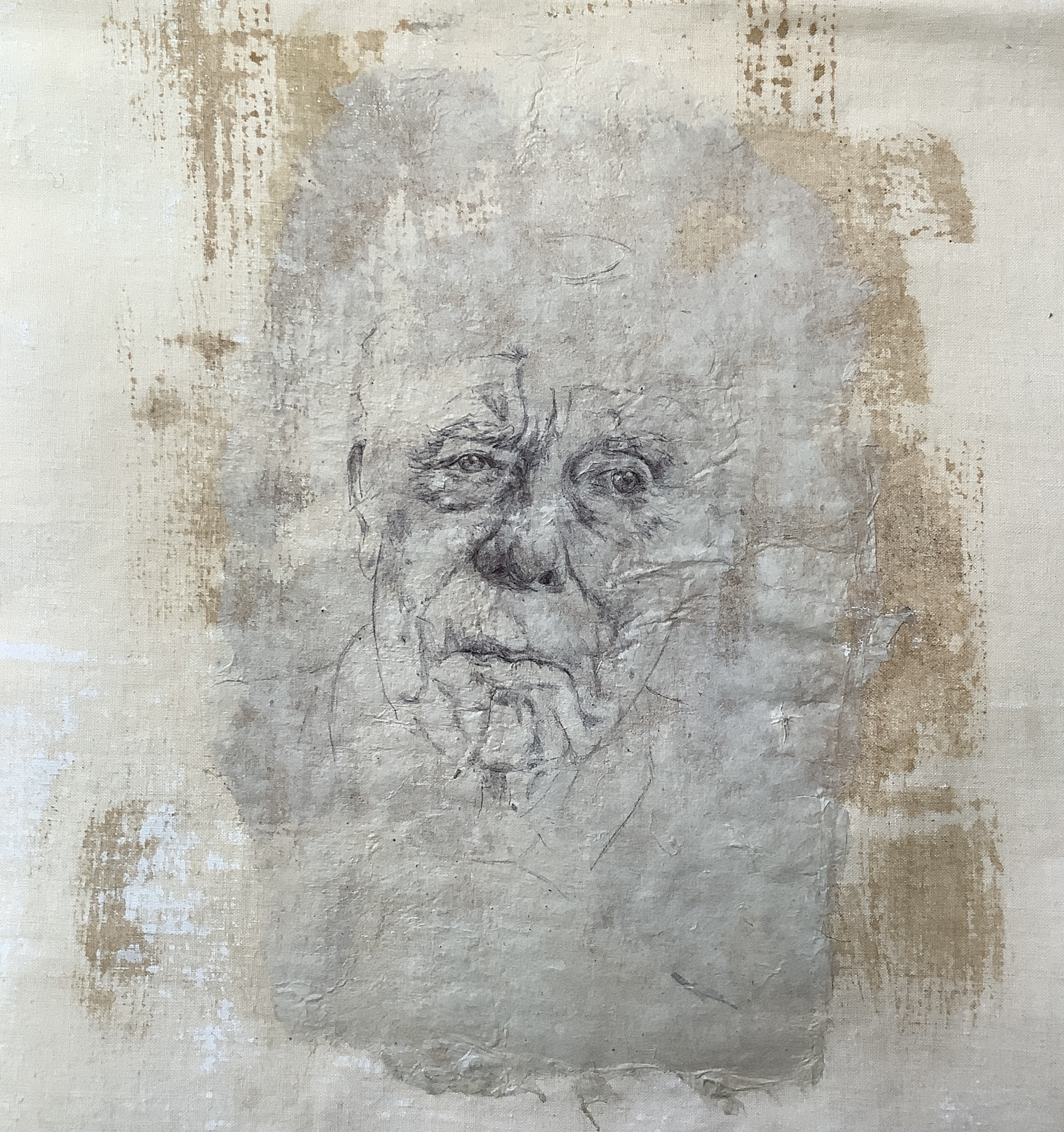 Ballpoint tekening op rijstpapier, collage op bedrukt katoen.