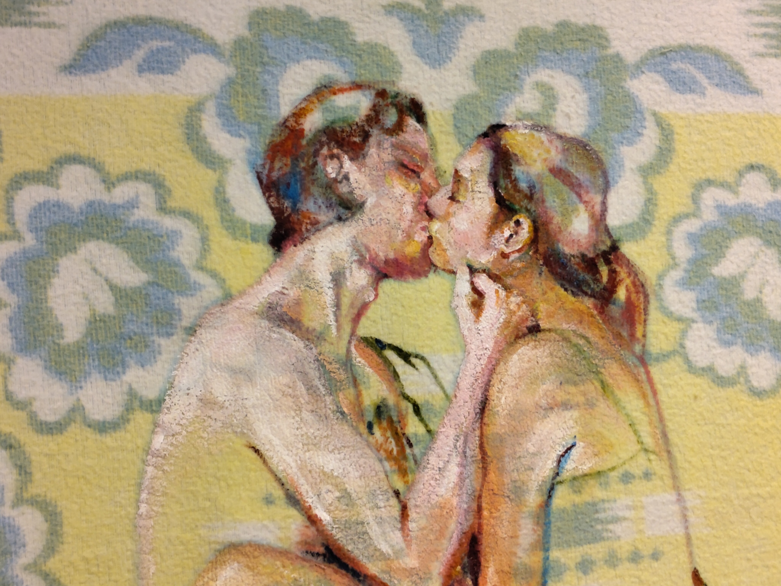 "Liefde" is gemaakt voor het kunstproject Feest van de Geest. Het is een verbeelding van één van de zeven bronnen van troost volgens Thomas van Aquino. Voor de expositie heb ik deze zeven bronnen geschilderd op oude dekens. Dekens zijn warm en troostrijk. De dekens hebben ongetwijfeld al veel meegemaakt en veel troost gebracht.